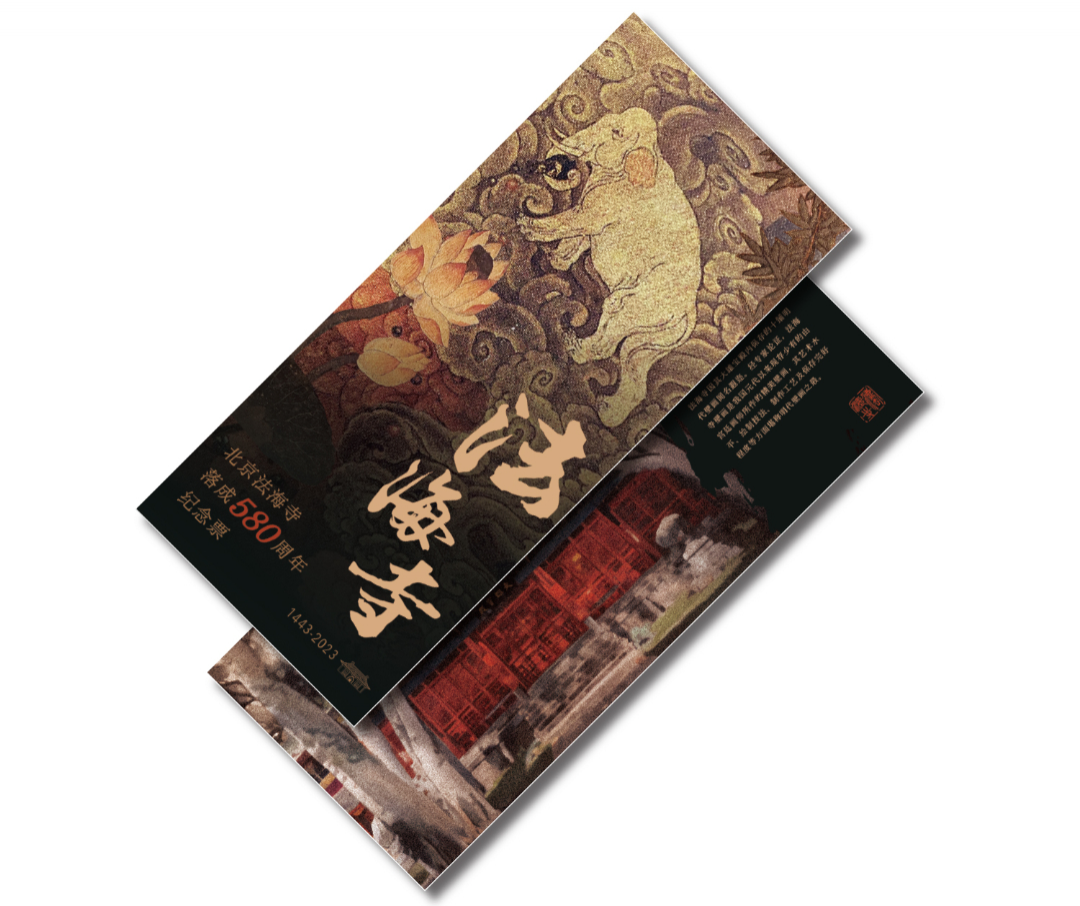 获得方式:自2023年12月23日起,购买壁画真迹票,凭真迹票撕取副券换取,每张壁画真迹票限换领1张法海寺落成580年纪念票。当天壁画真迹票相应的各场次壁画真迹参观前15分钟,在大雄宝殿前由工作人员统一组织换取纪念票,逾期作废。