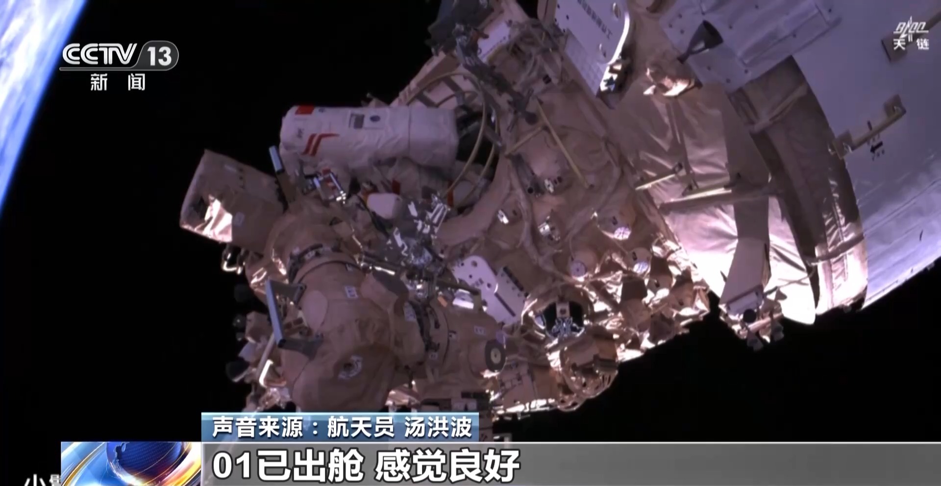 航天员 汤洪波:01已出舱,感觉良好。