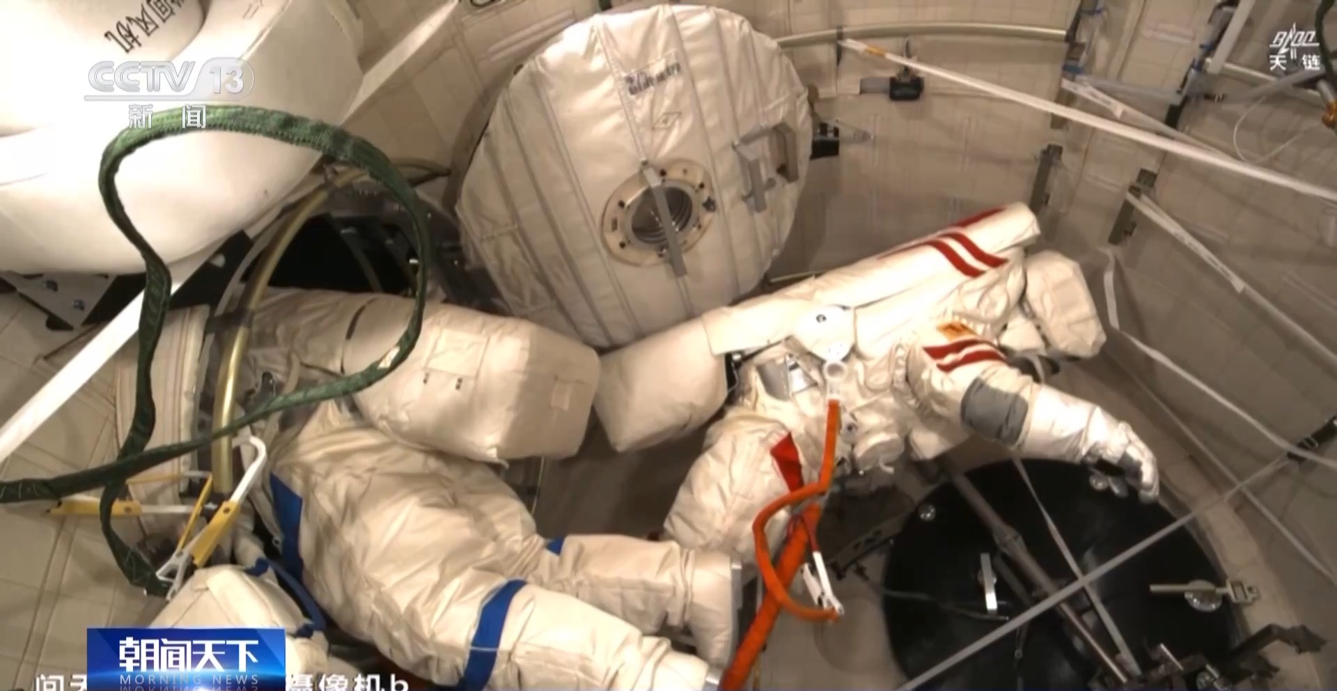 14时10分,身着红色舱外航天服的航天员汤洪波打开问天气闸舱出舱舱门。