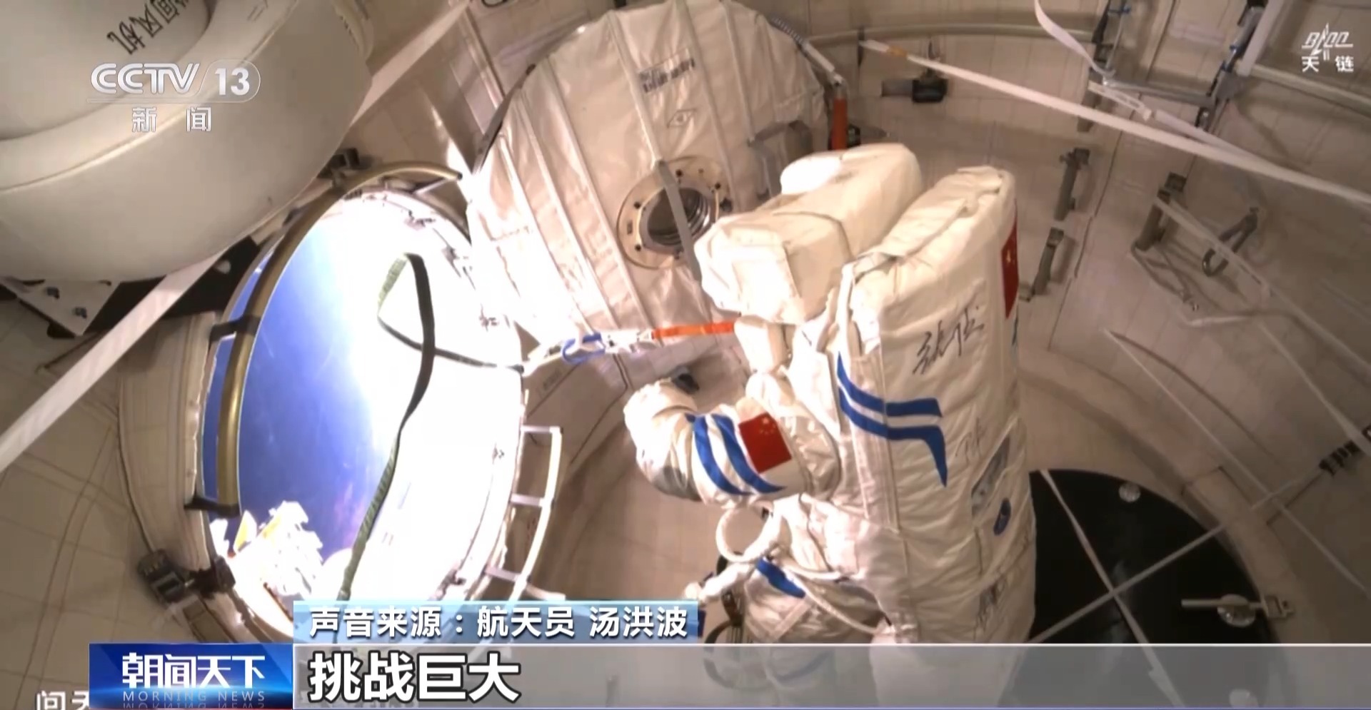 航天员 汤洪波:这次出舱意义非同寻常,挑战巨大,是一次真正意义上的在轨维修活动,此时此刻,身临其境,更加深刻地体会到了星空浩瀚无比,探索永无止境这句话的深刻内涵。