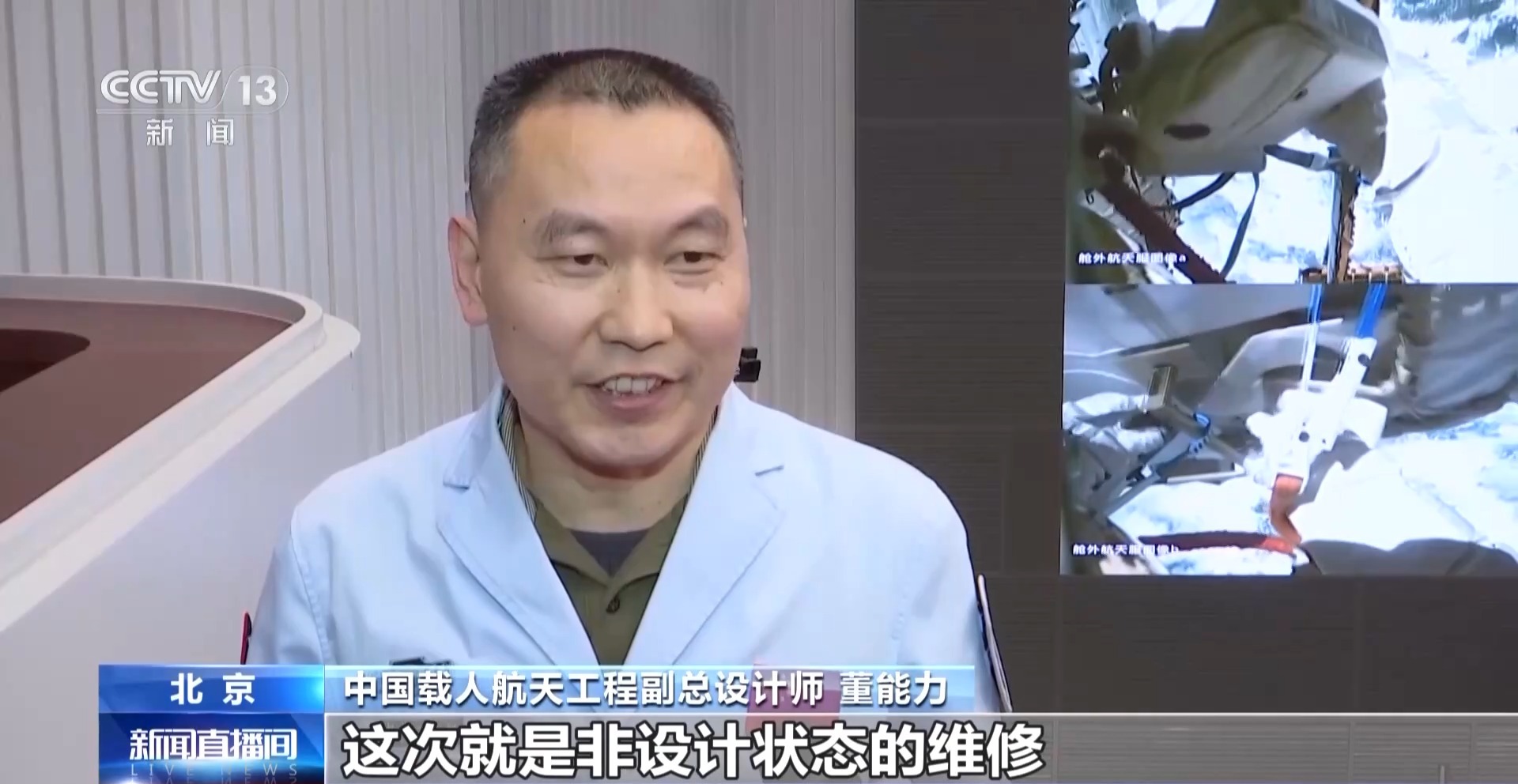 中国载人航天工程副总设计师 董能力:维修也分两类,一种是设计好的维修,一种是非设计状态的维修,这次是非设计状态的维修,前面几次出舱的主基调就是装、查,21日这次活动我们叫做是试验性维修。维修,它其实呈现着一定的不确定性。所谓的不确定性就是维修的对象以及维修的一些程序等等,需要根据具体的对象去设计,去验证,去操作。但是这个维修又是我们空间站保持长期稳定运行的能力,所以说我们必须要掌握维修的能力。