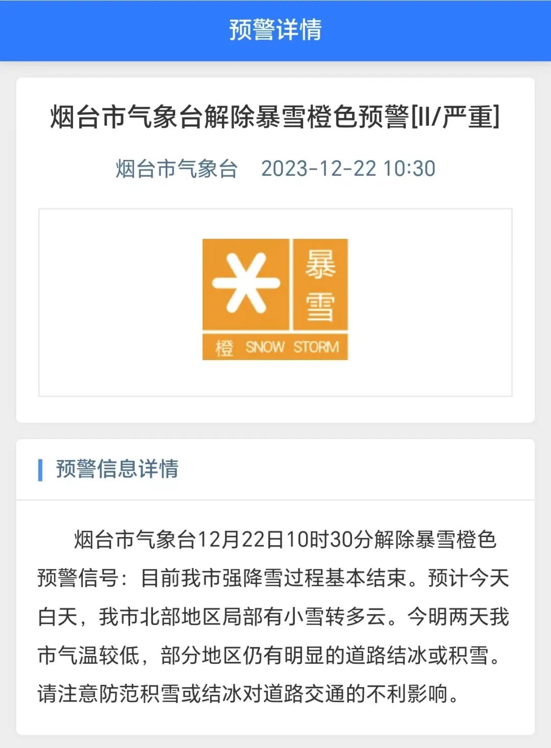烟台市气象台12月22日10时30分解除暴雪橙色预警信号:目前我市强降雪过程基本结束。预计今天白天,我市北部地区局部有小雪转多云。今明两天我市气温较低,部分地区仍有明显的道路结冰或积雪。请注意防范积雪或结冰对道路交通的不利影响。