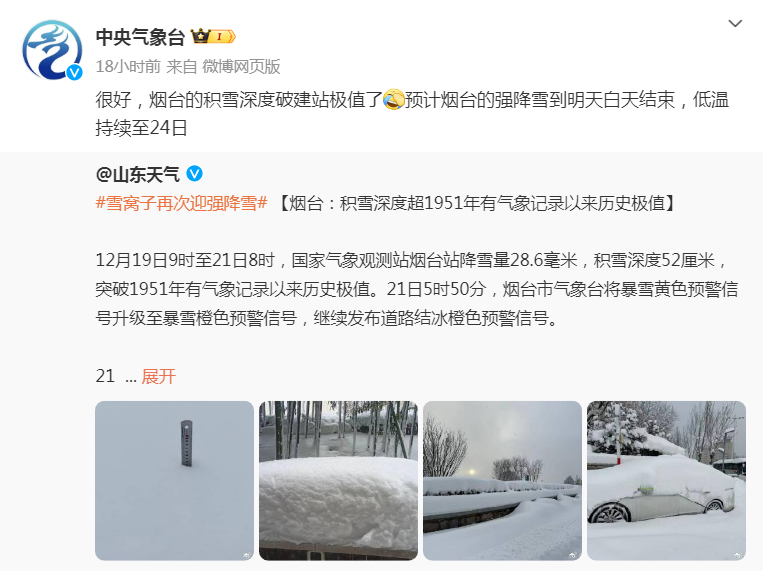 中央气象台预计,烟台和威海的强降雪到22日结束,未来几日气温将逐渐回暖。