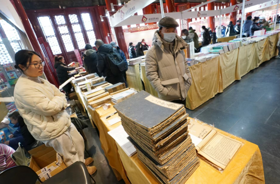 12月23日,“旧书新知·读书报国”古旧书展销在西城区报国寺举行,活动为期两天,分古旧书专区、文创展区、居民融合三大板块,涵盖古旧书展销、名家分享与签售、文创精品展示、儿童跳蚤市场、亲子汉服研学和国风cosplay打卡等内容。