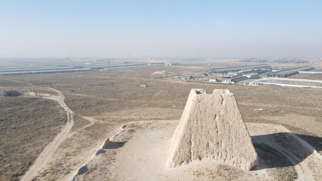 宁夏灵武市白土岗乡的白土岗烽火墩及远处的奶牛养殖基地。新华社记者许晋豫摄