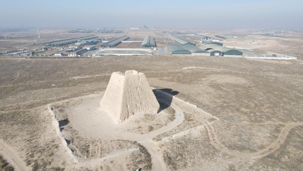 宁夏灵武市白土岗乡白土岗烽火墩及远处的奶牛养殖基地(无人机照片,2023年12月12日摄)。新华社记者 许晋豫 摄
