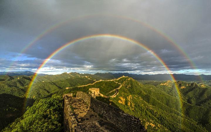 彩虹下的金山岭长城(2015年6月11日摄)。新华社发(段久军摄)