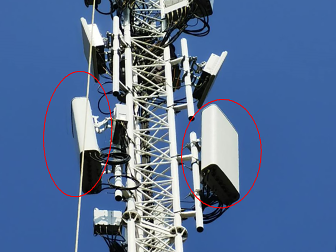 绿色能效天线挂在基站上。