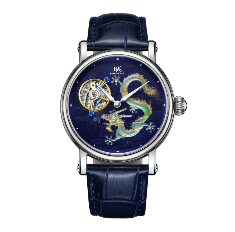 另一款上海表时迹龙年特别款玉龙款,表盘则选用深蓝色贝母材质,玉龙雕刻取色于龙泉青瓷之青,温润如水,仿佛龙威飞扬,再搭配高贵的蓝色皮质表带,展现出龙驭四海的威风磅礴。