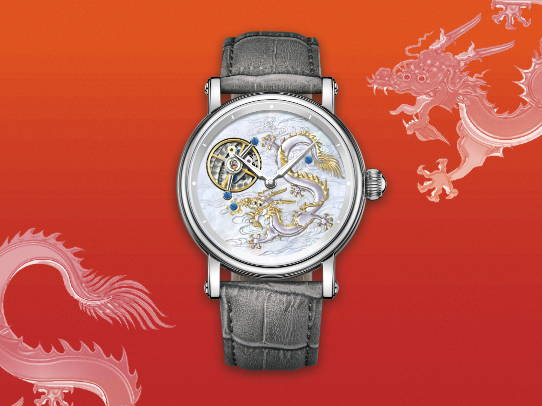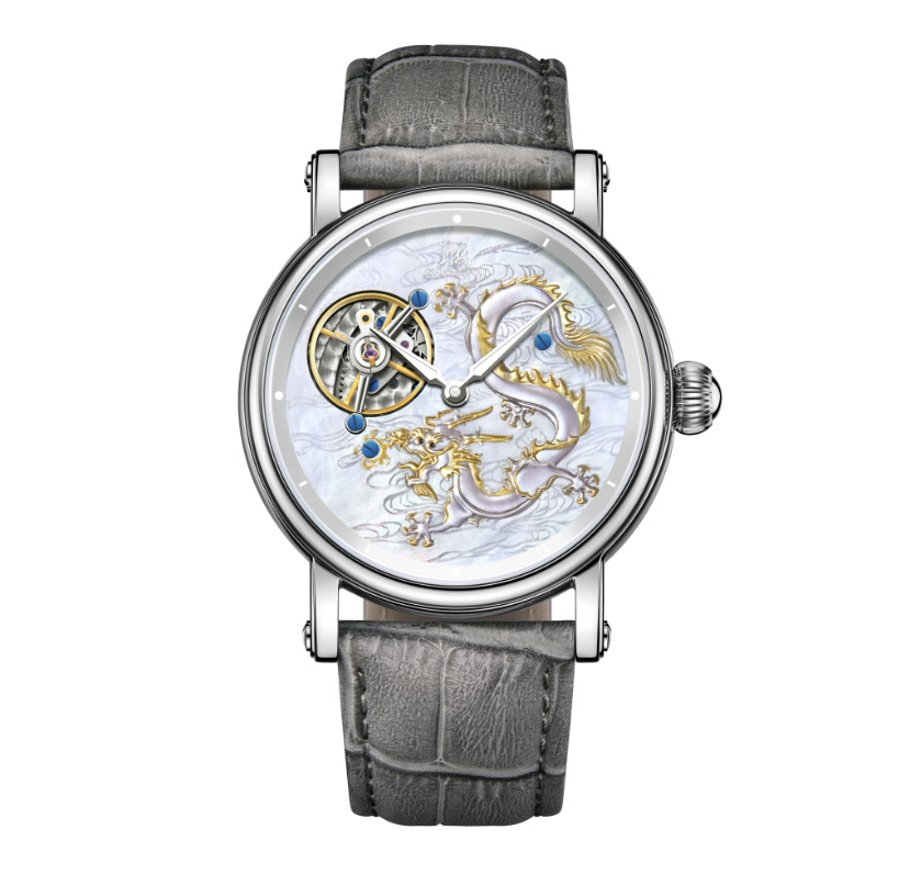 借鉴传统生肖中龙翔九霄的灵感,时迹系列龙年特别款设计巧妙绝伦,采用一小时转盘设计,贝母表盘饰有透明云纹和龙雕,其镂空摆轮沿着轨道进行公转,妙趣横生,更为遨游云海的瑞兽祥龙增添诗意,仿佛龙戏明珠,在方寸间演绎出源远流长的东方韵致。