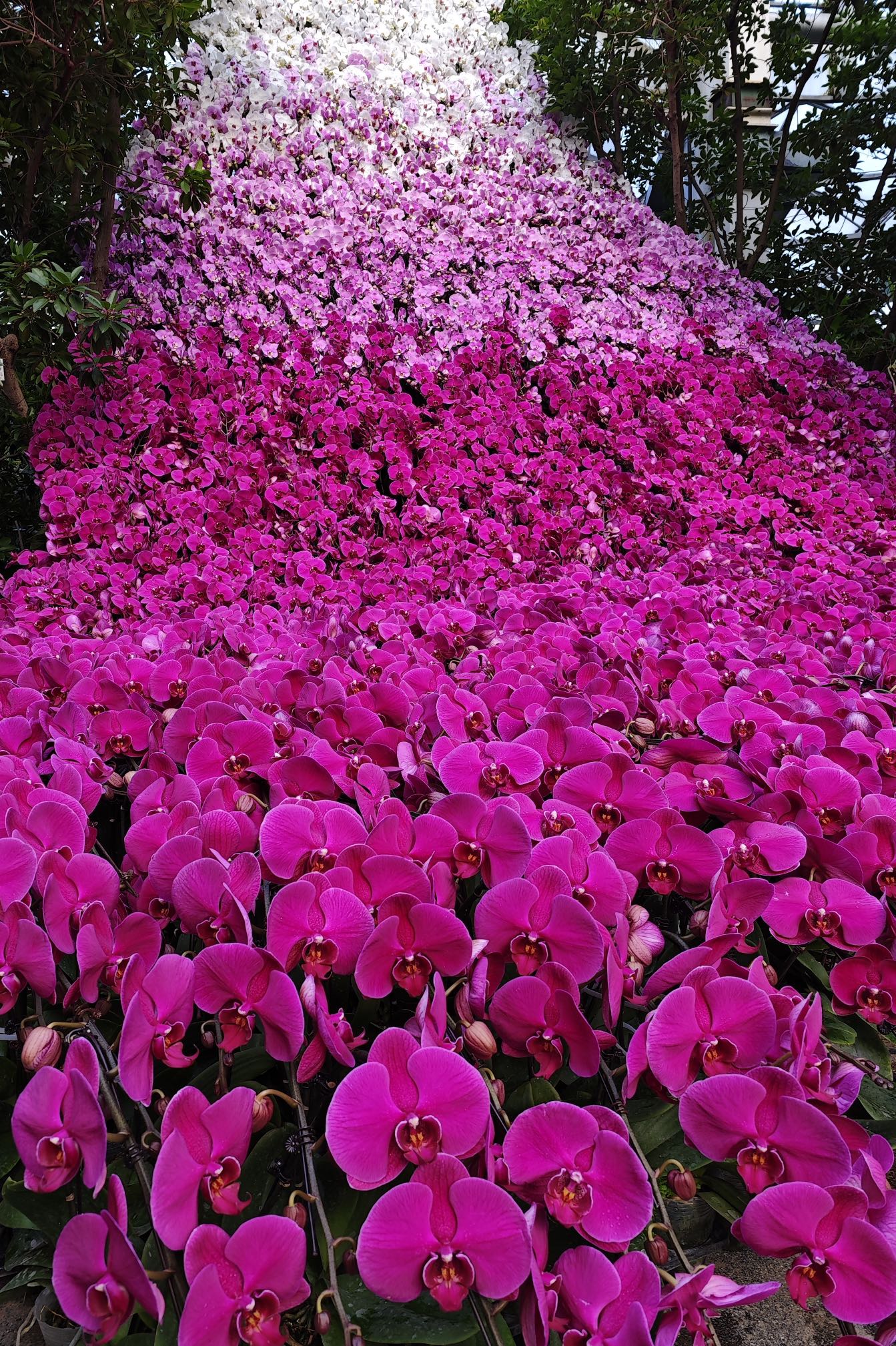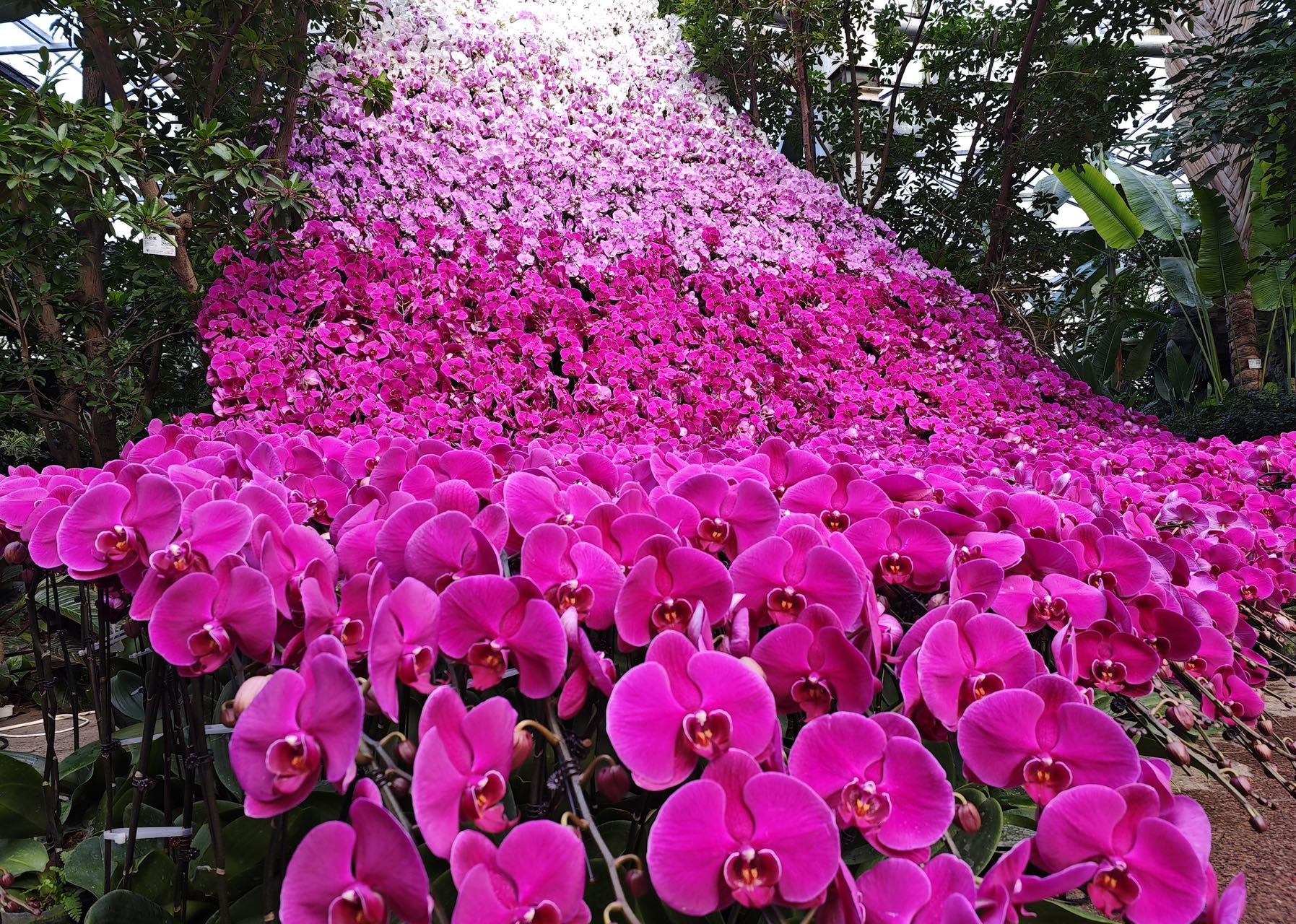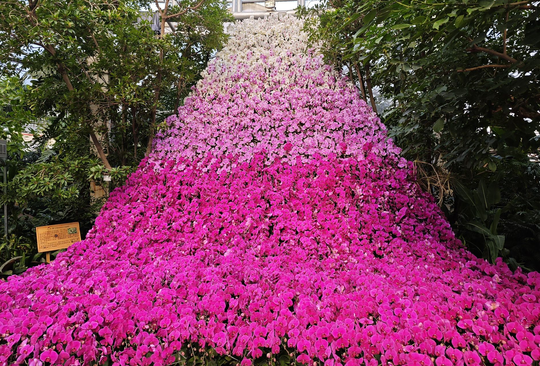 这个蝴蝶兰瀑布位于花卉大观园热带植物馆中央,“瀑布”从上到下由白色蝴蝶兰、淡粉色蝴蝶兰、粉色蝴蝶兰组成,宛若花瀑从天而降。