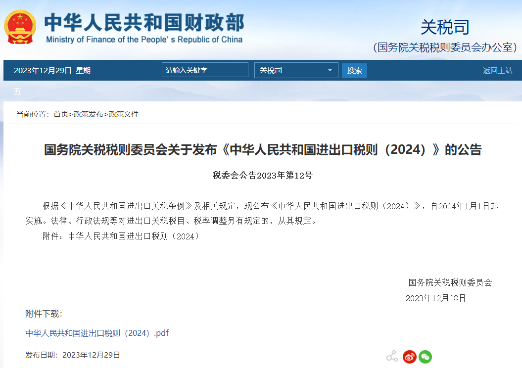 国务院关税税则委员会关于发布《中华人民共和国进出口税则(2024)》的公告