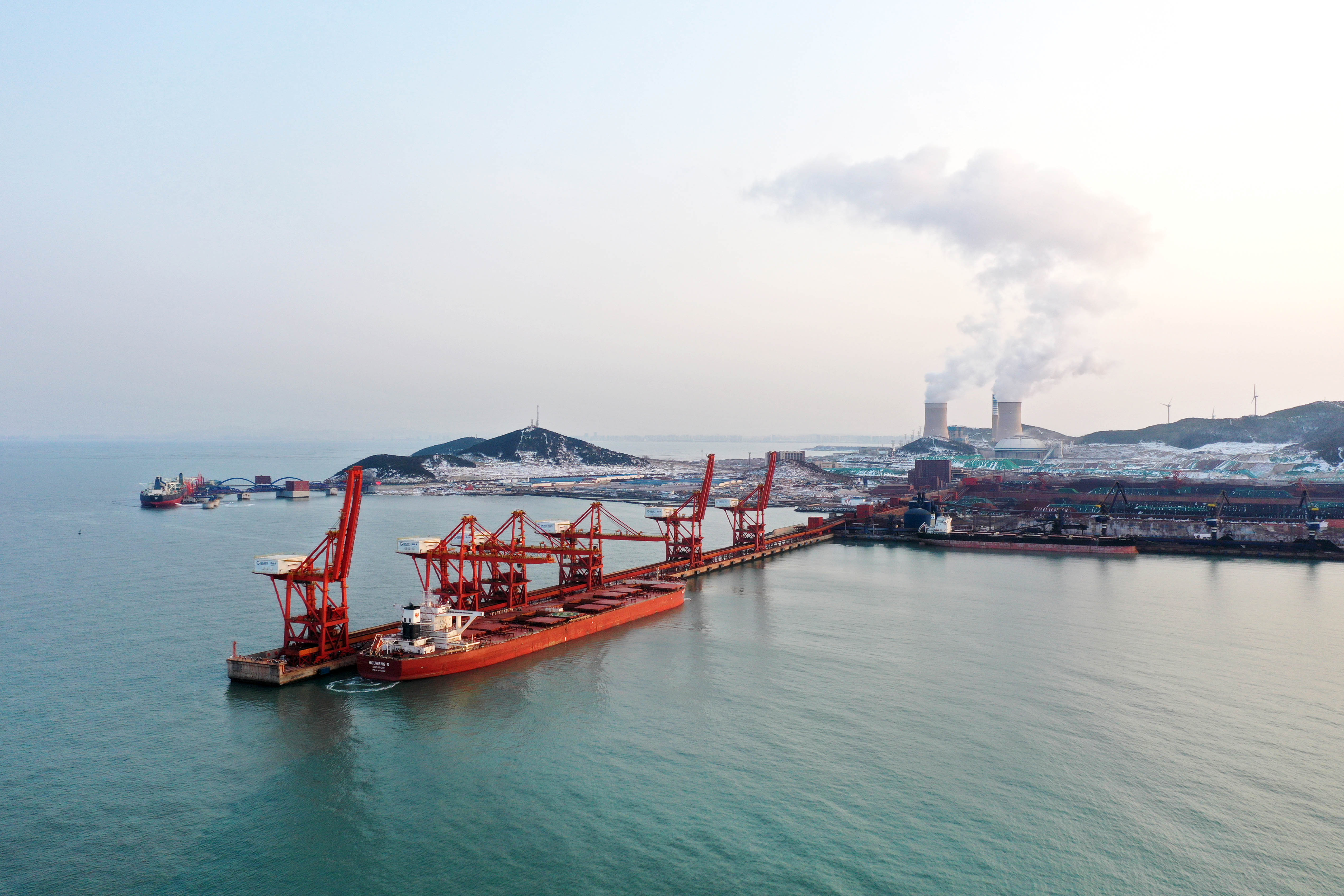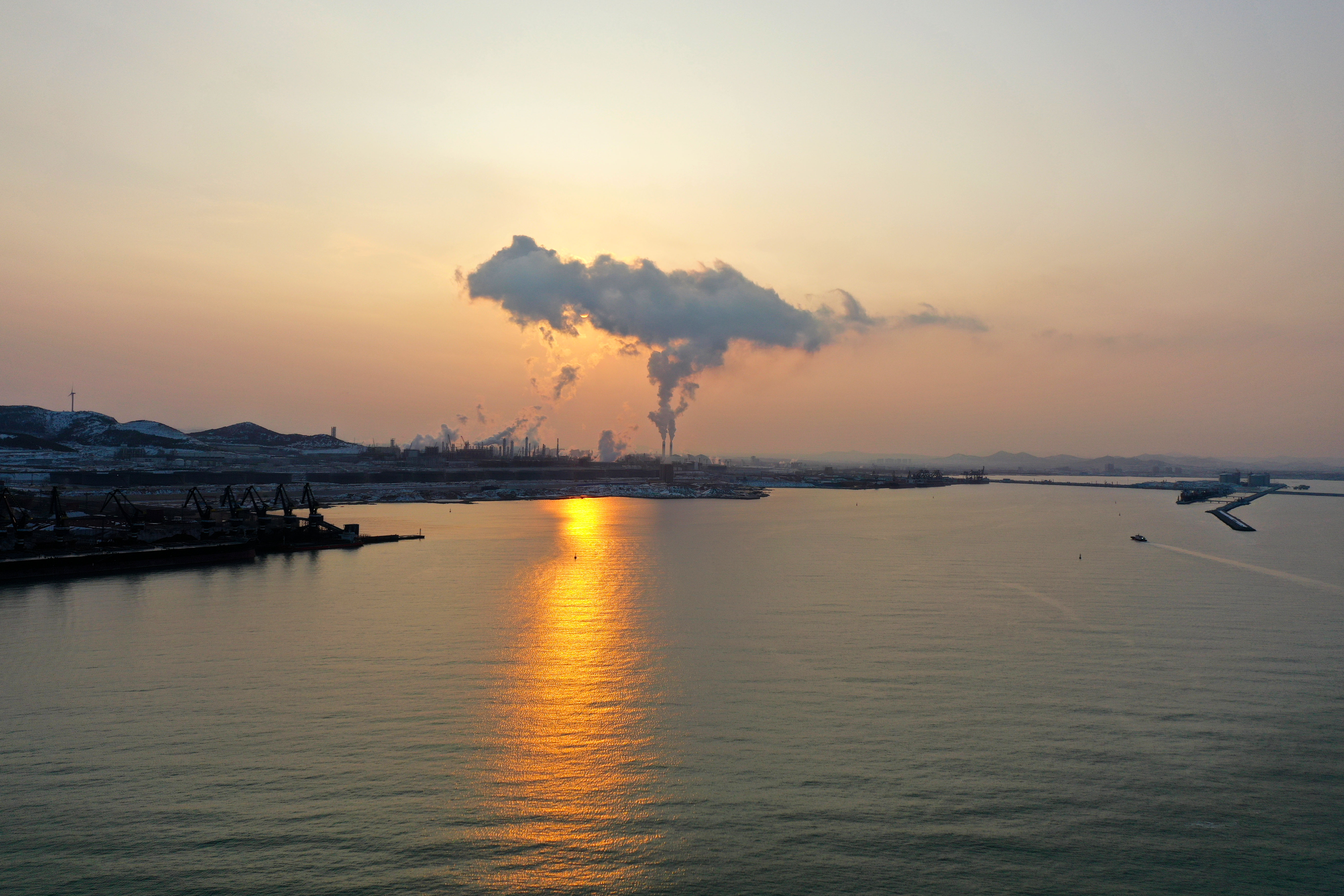 夕阳余晖之下的山东港口烟台港。