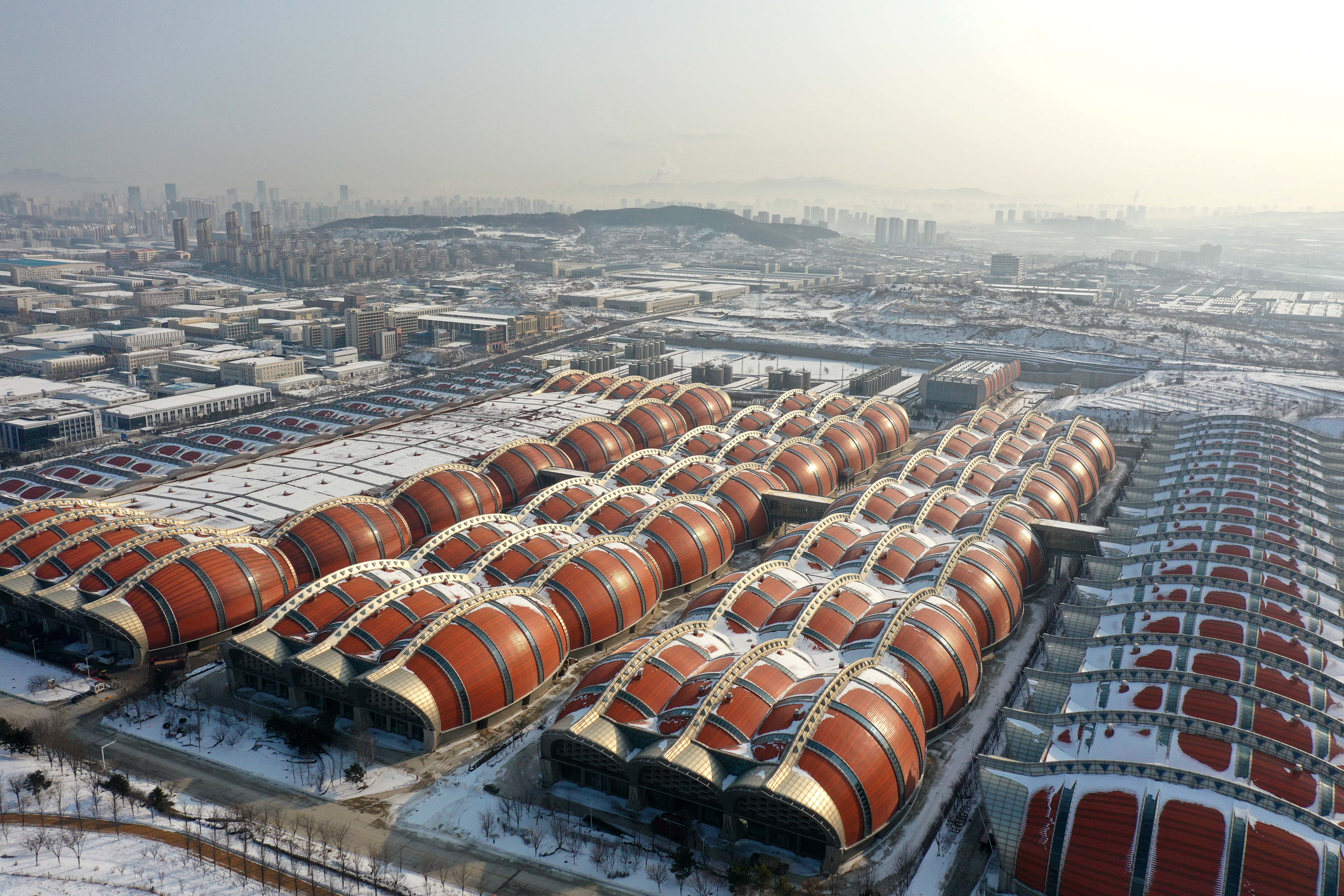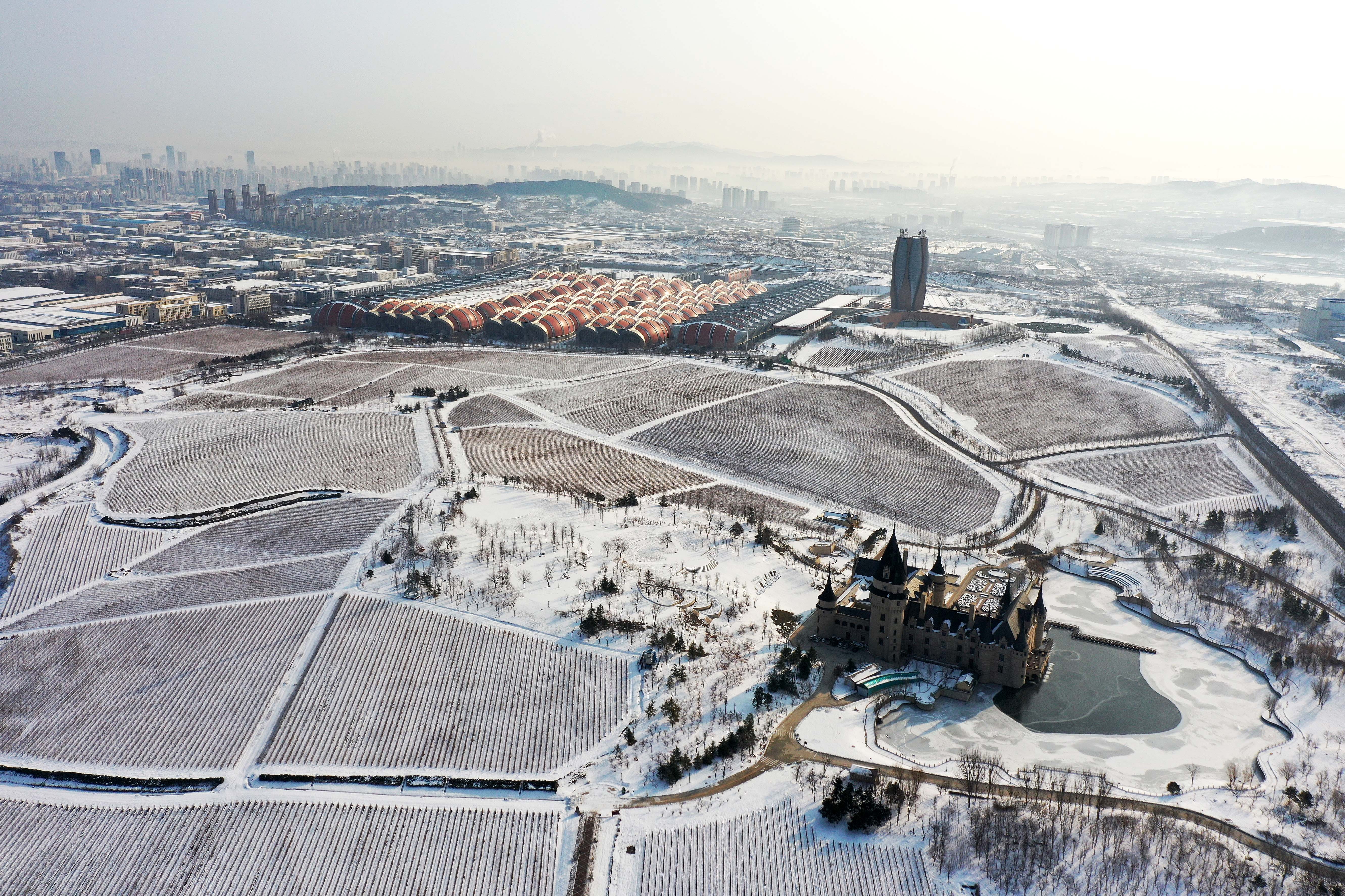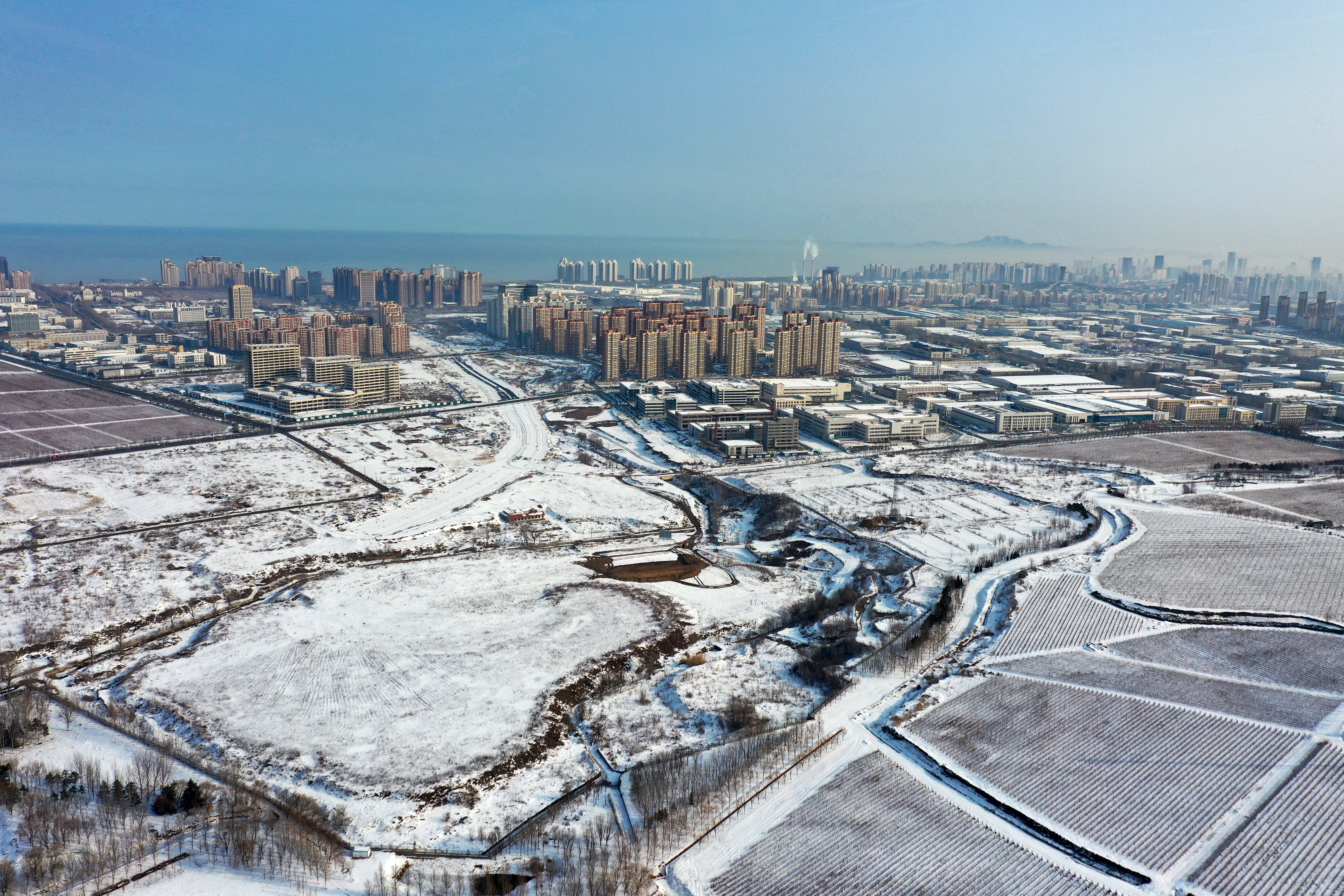烟台黄渤海新区,大雪覆盖广袤大地,海岸边一座新城正在崛起。