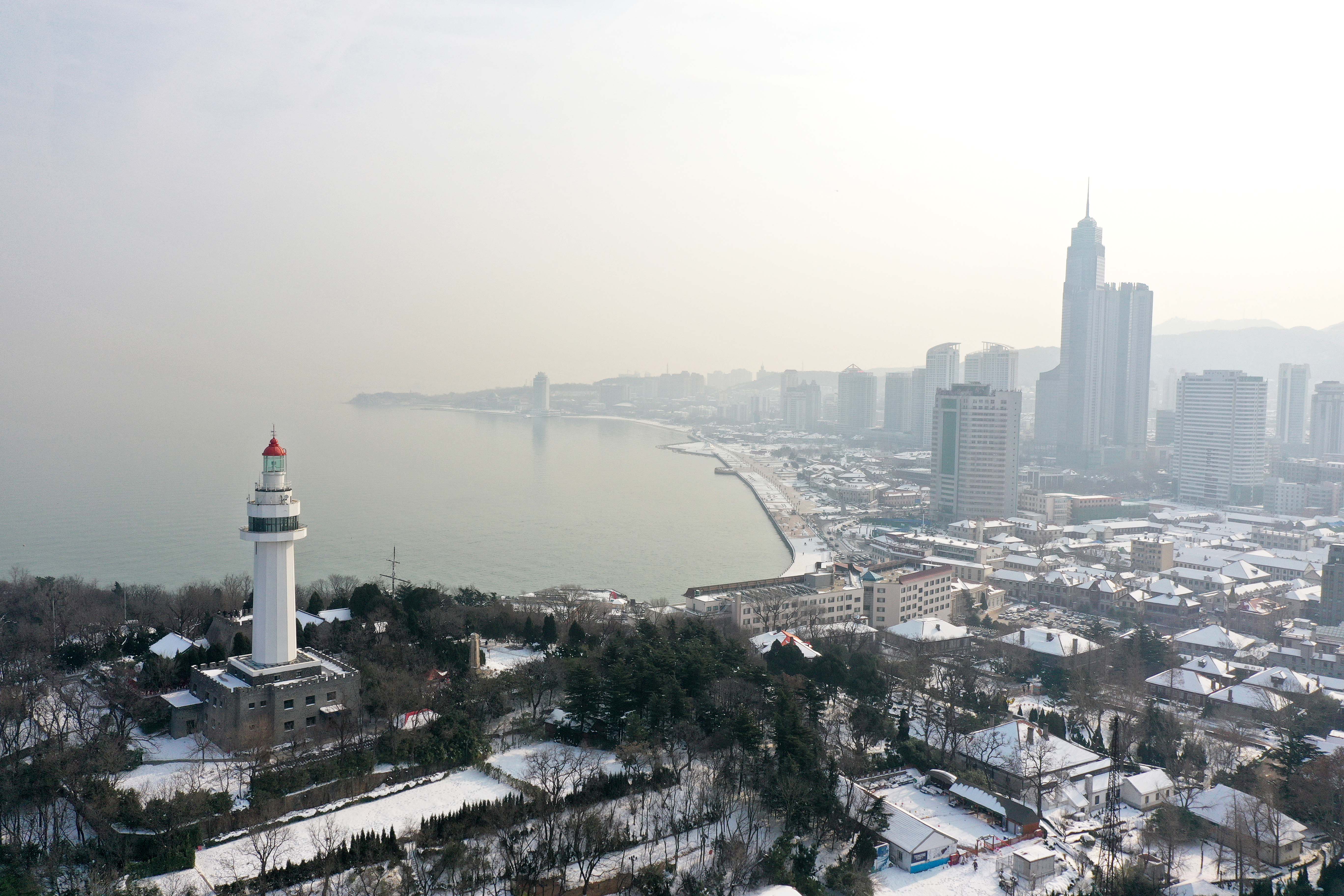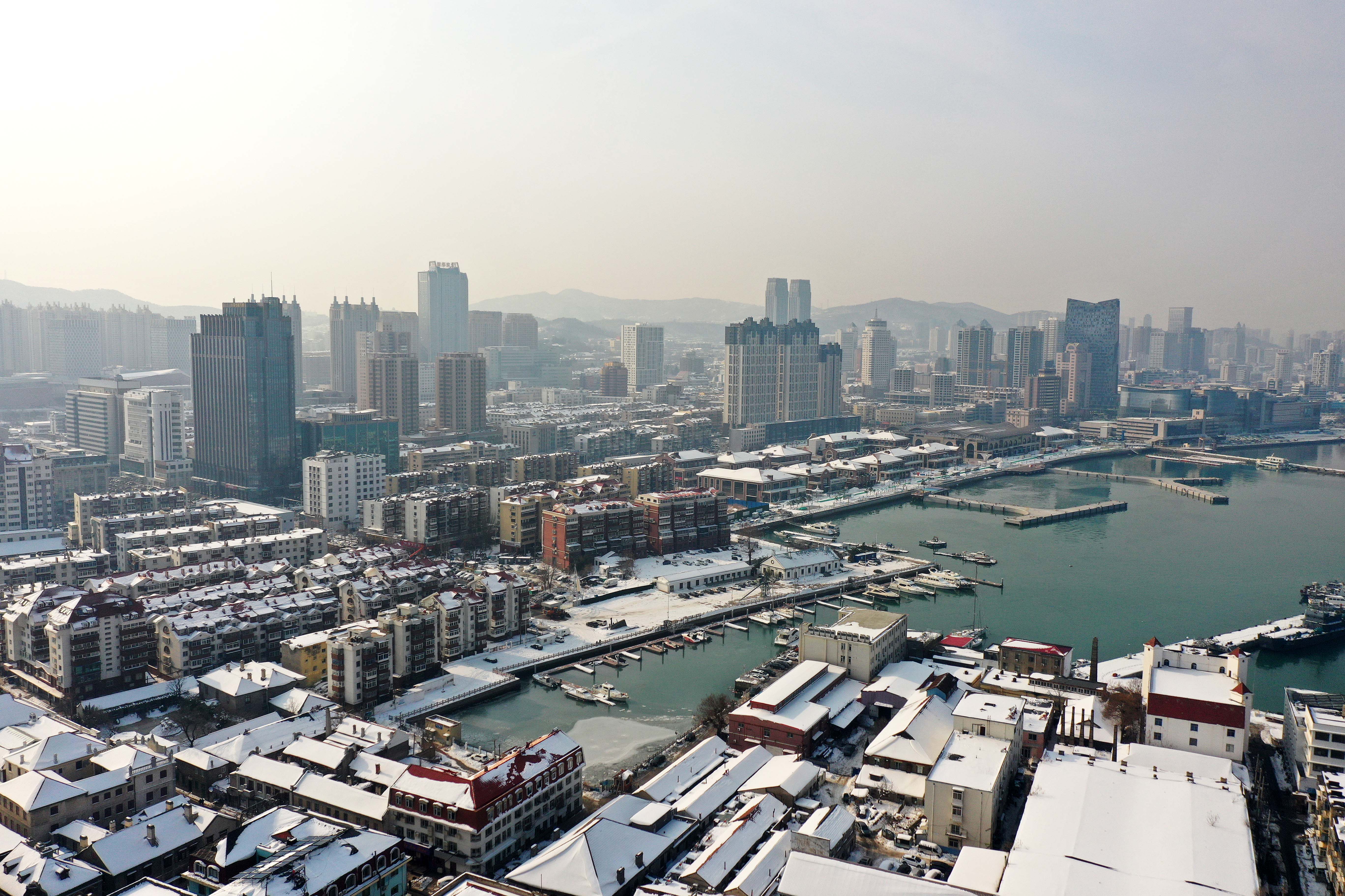 近日,山东半岛各地区遭遇冷流暴雪,部分区域积雪超半米。记者在雪后的港城——山东省烟台市,航拍下暴雪之后的壮美景观和发展生机。