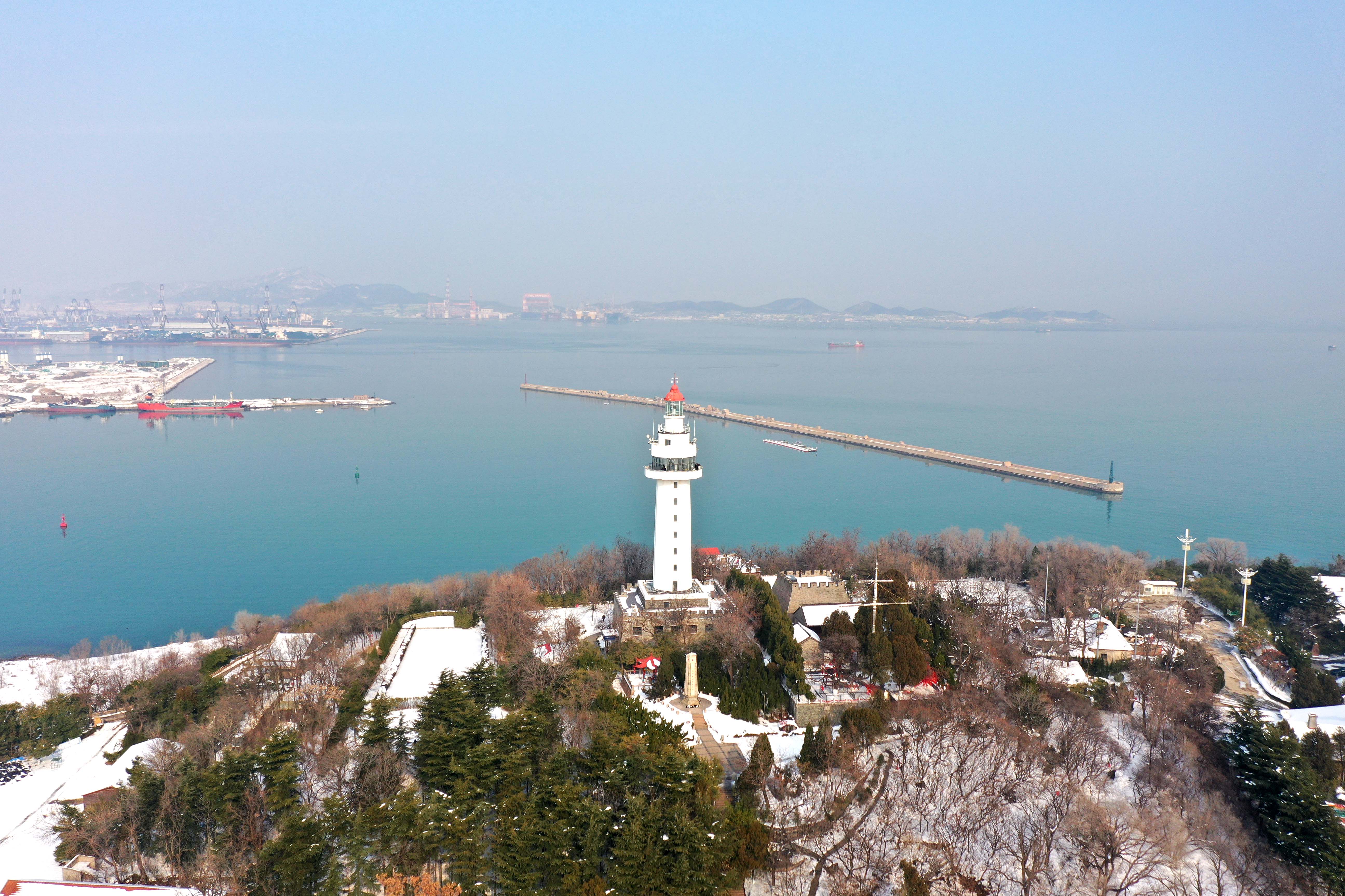 雪后烟台山银装素裹,面向大海,景色优美。