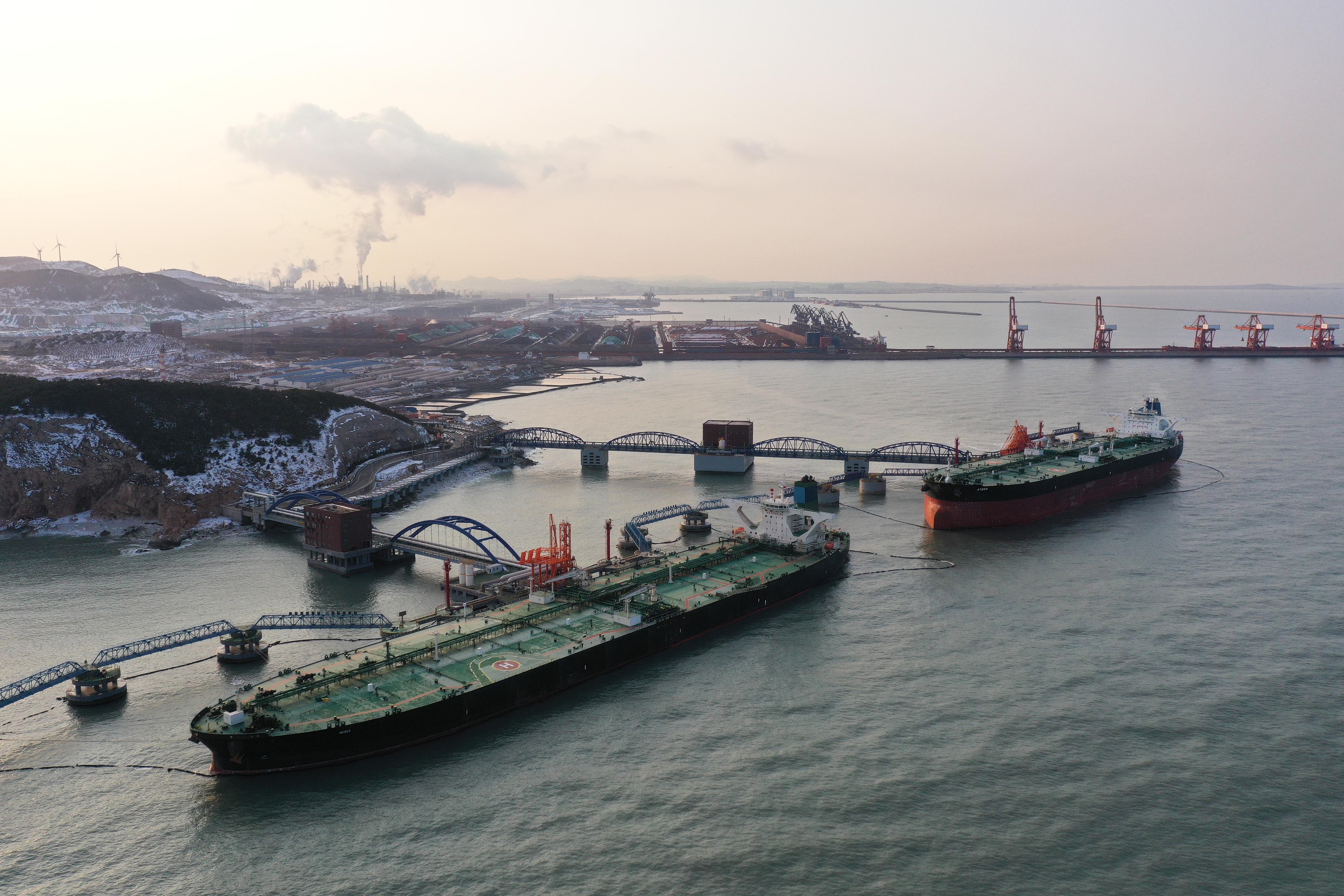 两艘超大型油轮“贵族”轮、“艾登”轮靠泊山东港口烟台港30万吨级原油码头。