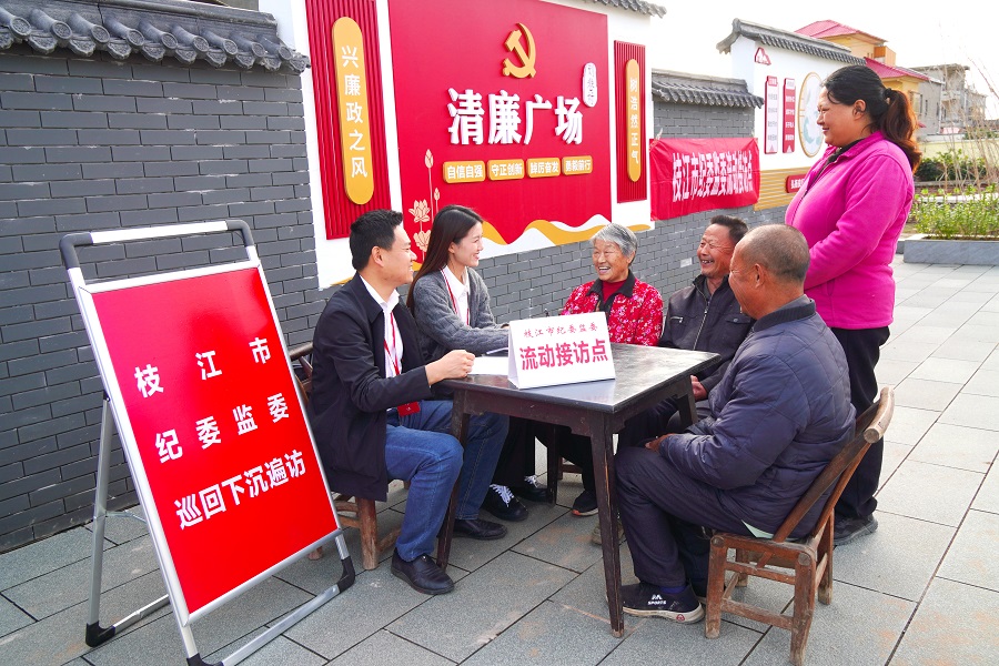 湖北省枝江市纪委监委聚焦基层小微权力运行,开展“纪检监察干部镇村行”大走访行动,围绕项目资金拨付、使用、监管等关键环节,坚决整治群众身边“微腐败”和作风问题。图为该市纪检监察干部在安福寺镇桑树河村走访了解情况。(湖北省枝江市纪委监委供 任薇 摄)