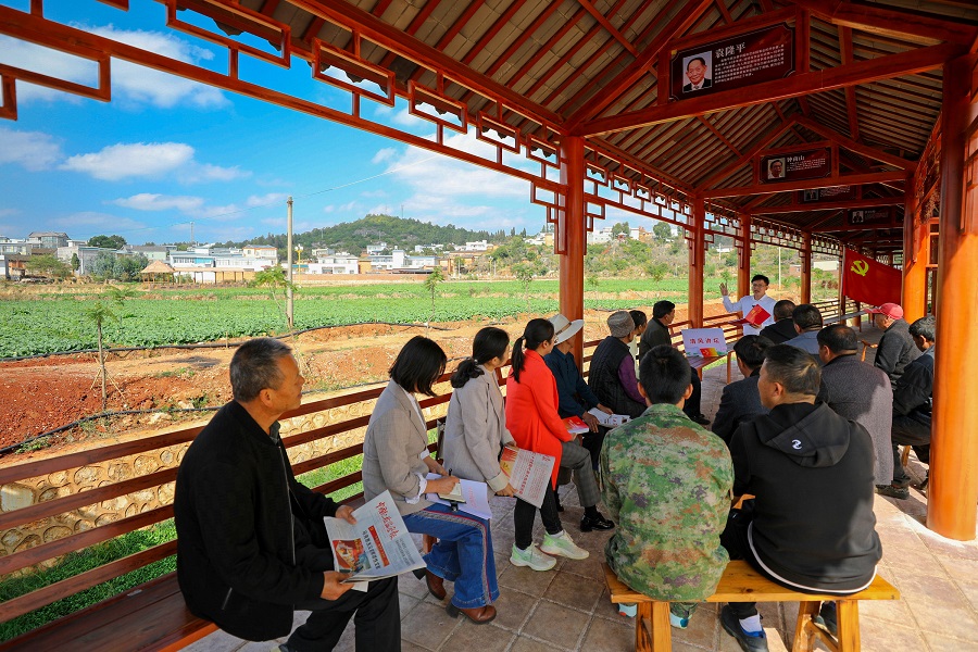 云南省陆良县纪委监委充分挖掘整理当地红色革命故事、历史名人清廉故事和清廉家风故事,组建“清风讲坛”宣讲团深入基层、深入群众开展廉洁文化宣讲活动,积极营造崇廉尚廉氛围。图为该县纪委监委“清风讲坛”宣讲员在群众中间开展宣讲活动。(云南省曲靖市陆良县纪委监委供 王勇 摄)