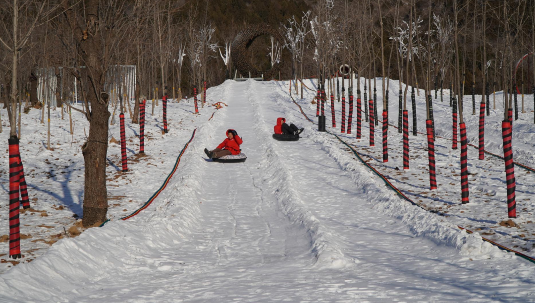 位于十三陵镇悼陵监村的那时明月·花溪谷占地约200亩,不仅设置了雪道滑雪、雪地捉迷藏等戏雪项目,还利用天然河道,打造了滑冰、冰上碰碰车、冰上保龄球等冰上项目,现场设置了非遗手作体验,游客可参与程度高,体验性强。