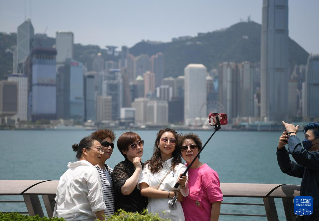 2023年4月30日,在“五一”假期期间,游客在香港星光大道自拍合影。 新华社记者 陈铎 摄