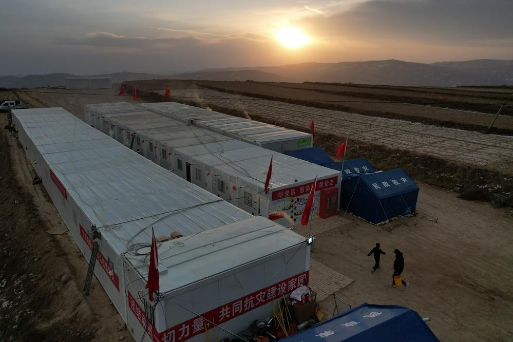 1月1日,在甘肃省积石山县刘集乡团结村安置点,村民在板房外聊天。新华社记者 范培珅 摄