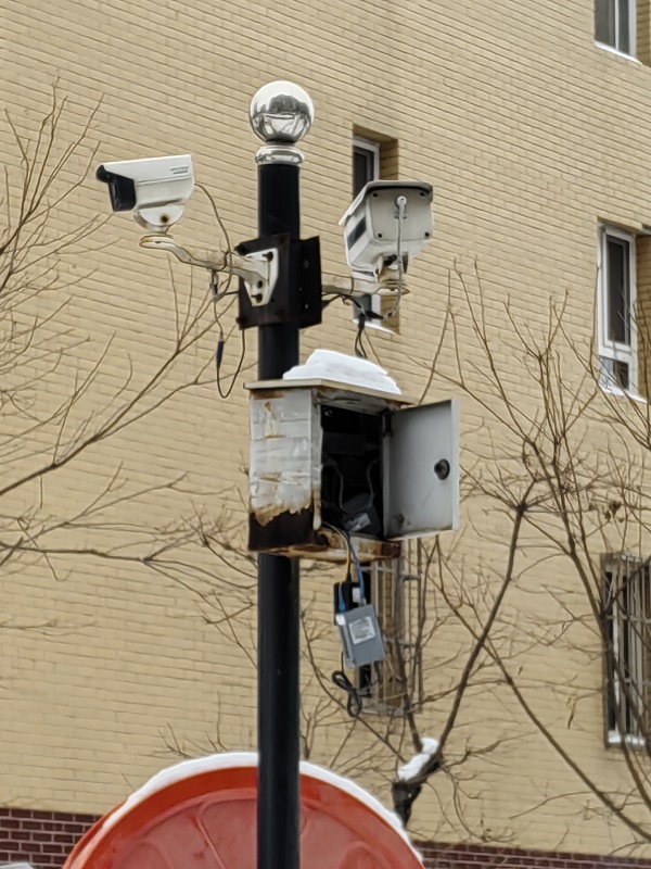 记者走访发现,该小区内每隔十多米距离,就在金属杆上安装了一处监控摄像头。每一处监控摄像头的个数有所差异,少则一个,多则三个,且监控摄像头的型号也不一致。从小区西北门开始,沿着小区内部道路和楼栋走访,整个小区有约20处摄像头。其中,多处摄像头的零件与电线悬空裸露,电线上有胶带缠绕痕迹,摄像头支撑金属件和金属箱体锈迹斑斑。有的摄像头的金属箱体箱盖松动,在寒潮大风中一会儿打开,一会儿关闭。