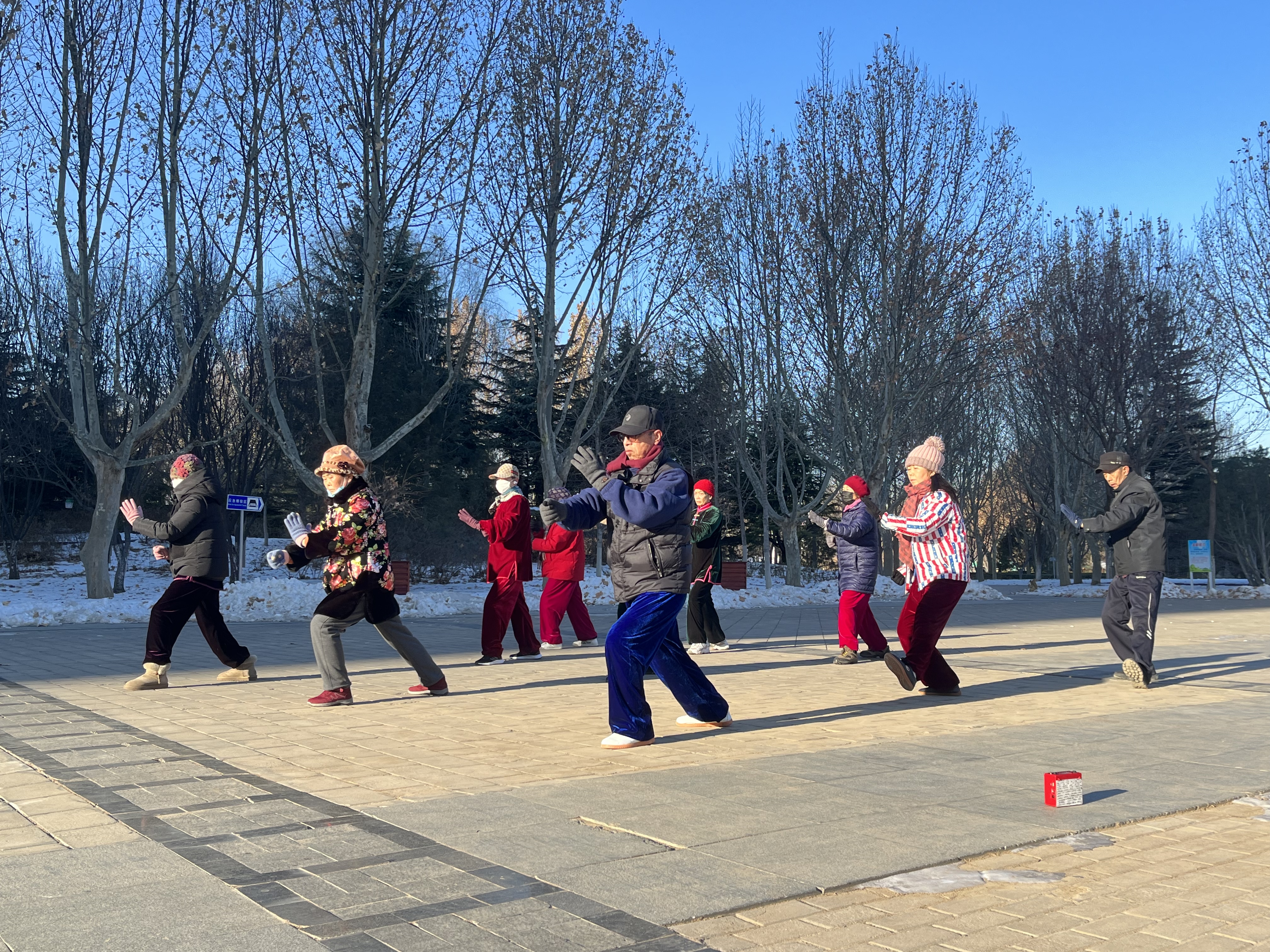 早上8点多,博大公园内已有不少健身爱好者,健身步道上,大爷甩开双臂快速走。两支社区居民自发组建的文体队伍,正在广场上打着太极拳。古稀老人王大雨带着两位“徒弟”习武健身,一招一式干净利落。“我们是之前逛公园认识的,看我练棍感兴趣,他俩就一直跟着学了。我们每天早上都会过来,假期也照旧!”老人笑着说。