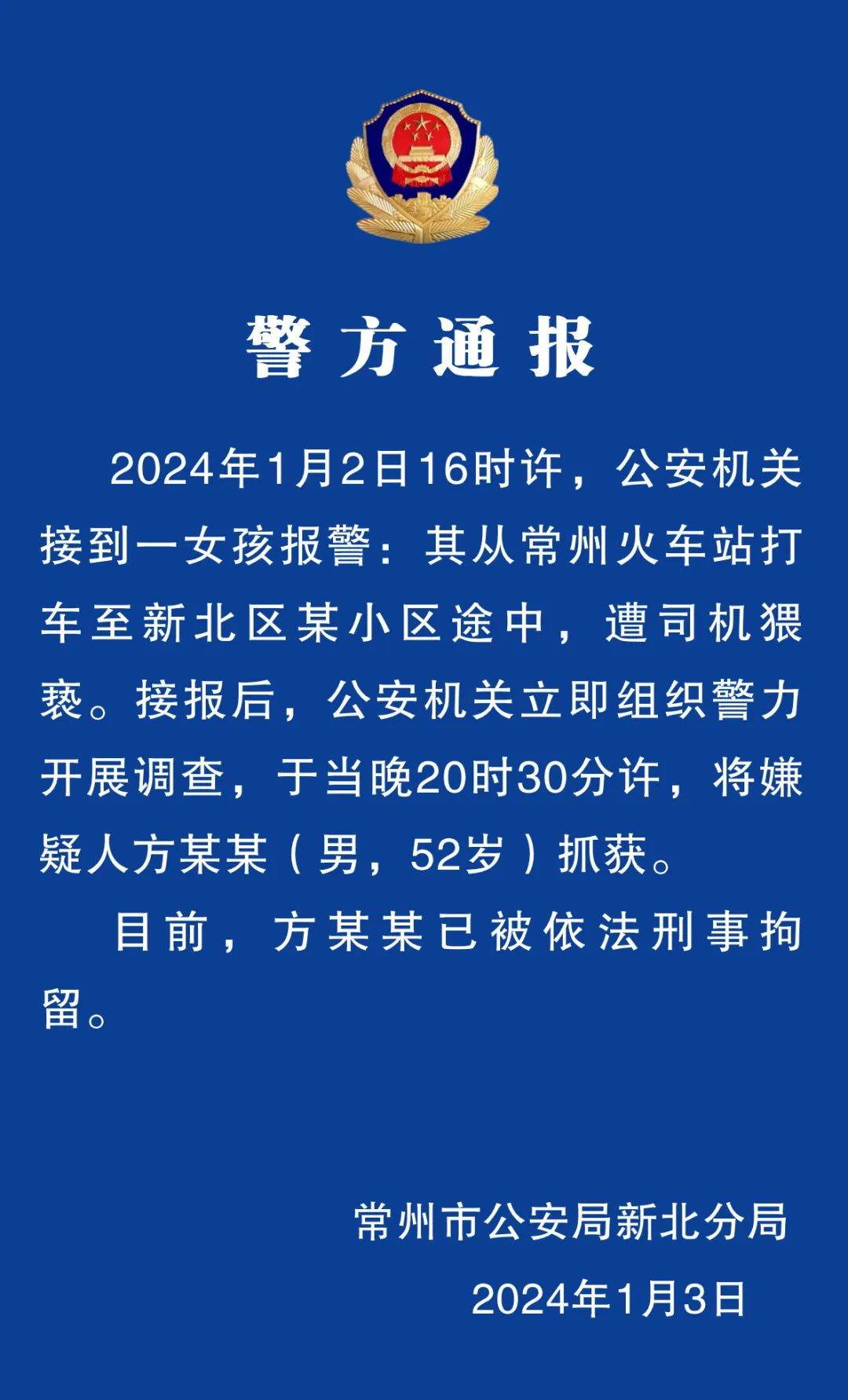 1月3日,常州市公安局新北分局发布警方通报,1月2日16时许,公安机关接到一女孩报警:其从常州火车站打车至新北区某小区途中,遭司机猥亵。接报后,公安机关立即组织警力开展调查,于当晚20时30分许,将嫌疑人方某某(男,52岁)抓获。目前,方某某已被依法刑事拘留。