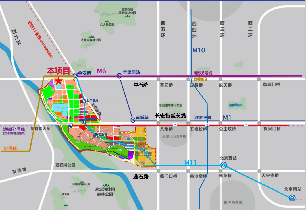 首钢冬奥广场位于长安街西延线,距离天安门仅约 16 公里,毗邻新首钢大桥;项目紧邻主干道,北接阜石路,半小时左右即可快速通达北京主要核心区域;距6号线金安桥站550米,1公里内地铁1号线、6号线、11号线、S1线及 R1线共五条地铁线路交汇,周边多条公交线路均可到达。