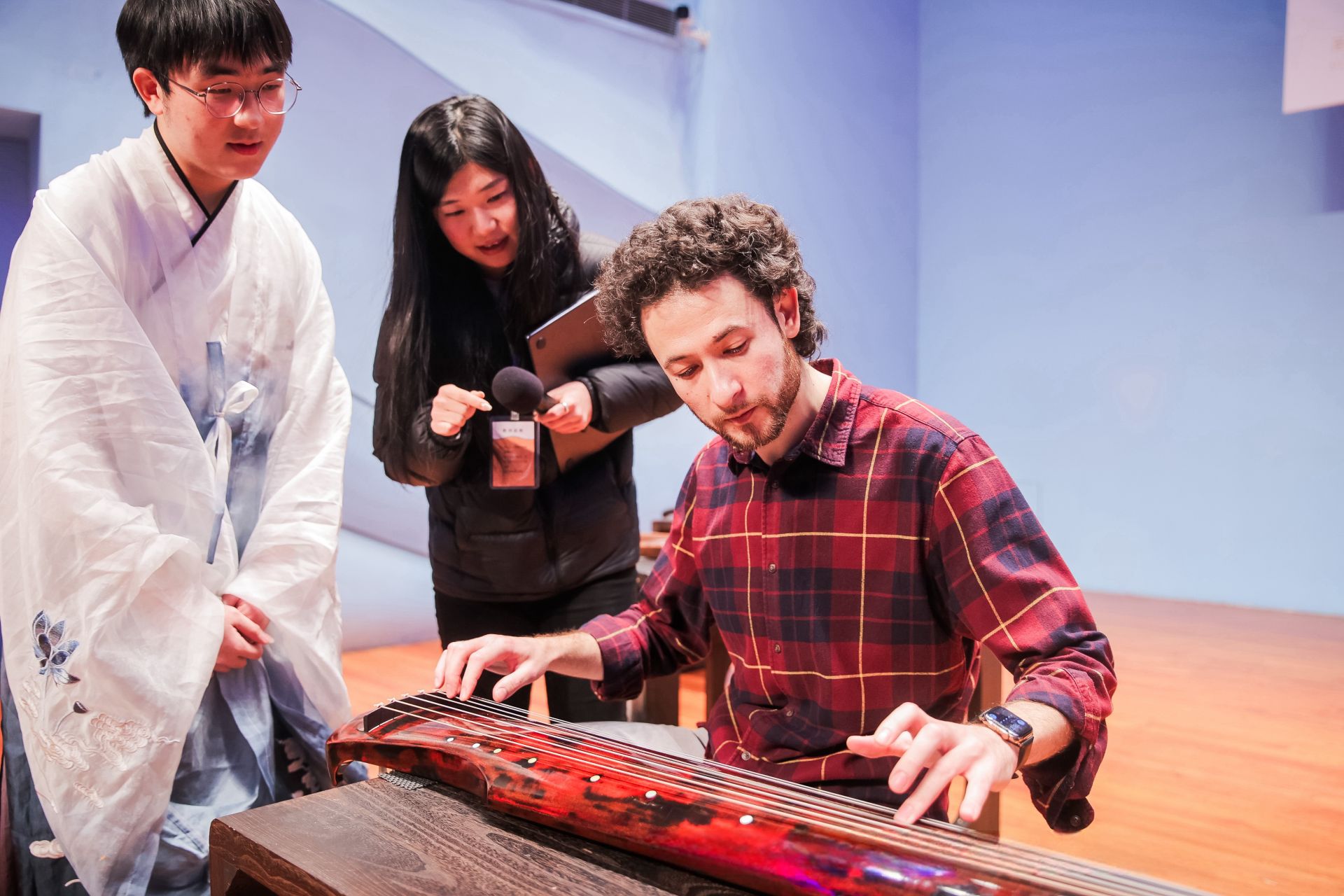 (▲俄罗斯圣彼得堡交响乐团指挥迪米特里斯·博蒂尼斯体验中国古琴)