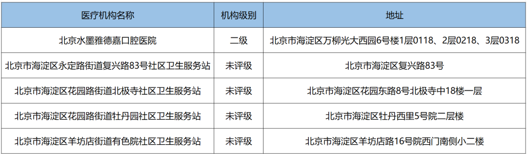 记者从海淀区医疗保障局了解到,本次新增的5家定点医疗机构中,包括4家社区卫生服务站和1家口腔专科医院,更好地保障了永定路、羊坊店、花园路3个街镇社区居民就近获得基层医疗服务的迫切需求,进一步丰富了口腔诊疗服务资源,参保人员无需事先将其选为定点,可以直接到这5家定点医疗机构就医。