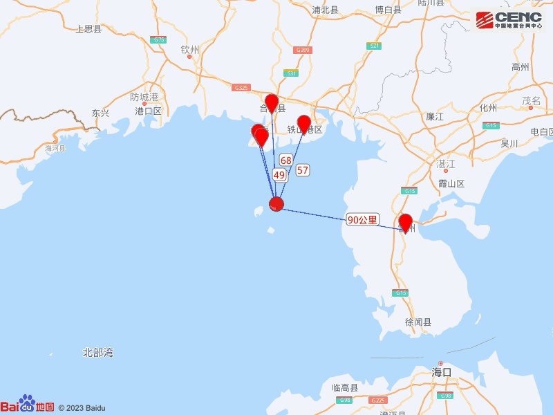 据中国地震台网正式测定,1月4日22时29分在广西北海市银海区海域发生4.2级地震,震源深度9公里,震中位于北纬21.05度,东经109.24度。震中距离涠洲岛14公里、北海市城区50公里、合浦县城区69公里,距离南宁市217公里。