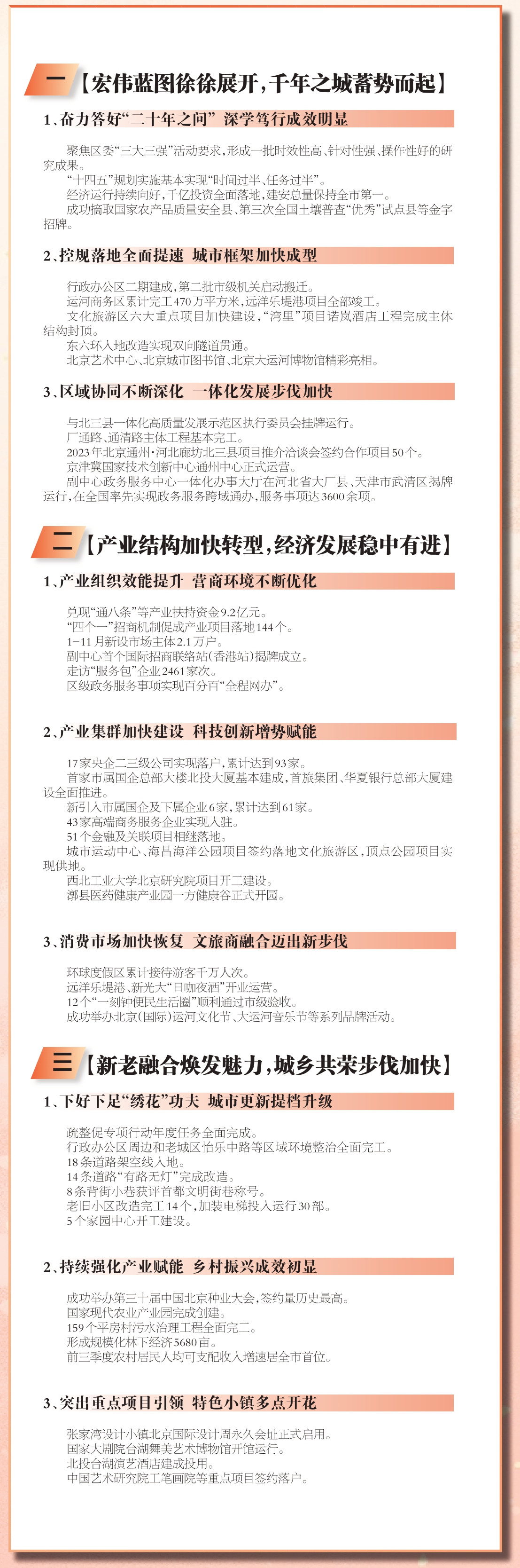 2023年是全面贯彻落实党的二十大精神开局之年,也是实施“十四五”规划承上启下、推动城市副中心“立长远、强功能,全面上台阶”的关键一年。通州区聚焦回答市委“二十年之问”,踔厉奋发、勇毅前行,城市副中心高质量发展步伐持续加快。
