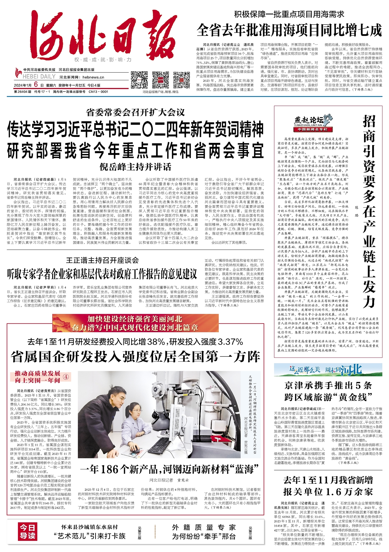 记者从河北省国资委获悉,2023年1至11月,河北省国资委监管企业研发经费投入206.56亿元,同比增长38%;研发投入强度为3.37%,同比增长0.86个百分点,研发投入强度在全国省级监管企业中位居第一方阵。详情>>