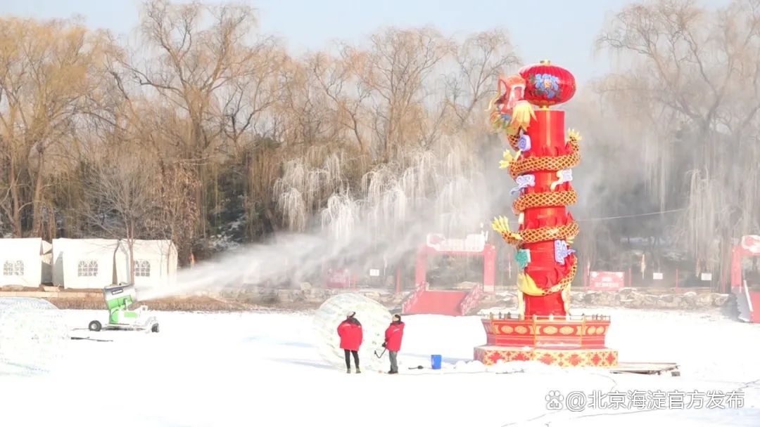 圆明园雪场主题活动区域位于松风萝月湖,相较往年,此次雪场面积增加至2万平方米。雪场内搭建了一座长32米,宽80米,高6米的雪圈滑道,共36条滑道,最多可供36人同时畅游雪地。大小朋友们坐上雪圈,俯冲而下,听着耳畔呼啸的风声,感受雪地的速度与激情。为庆祝甲辰龙年,雪场中央耸立的8米盘龙柱花灯成为了游客拍照打卡的聚集地。另外,雪场还设有蹴鞠、投壶、雪地龙舟船、儿童无动力玩具等免费项目供游客游玩。