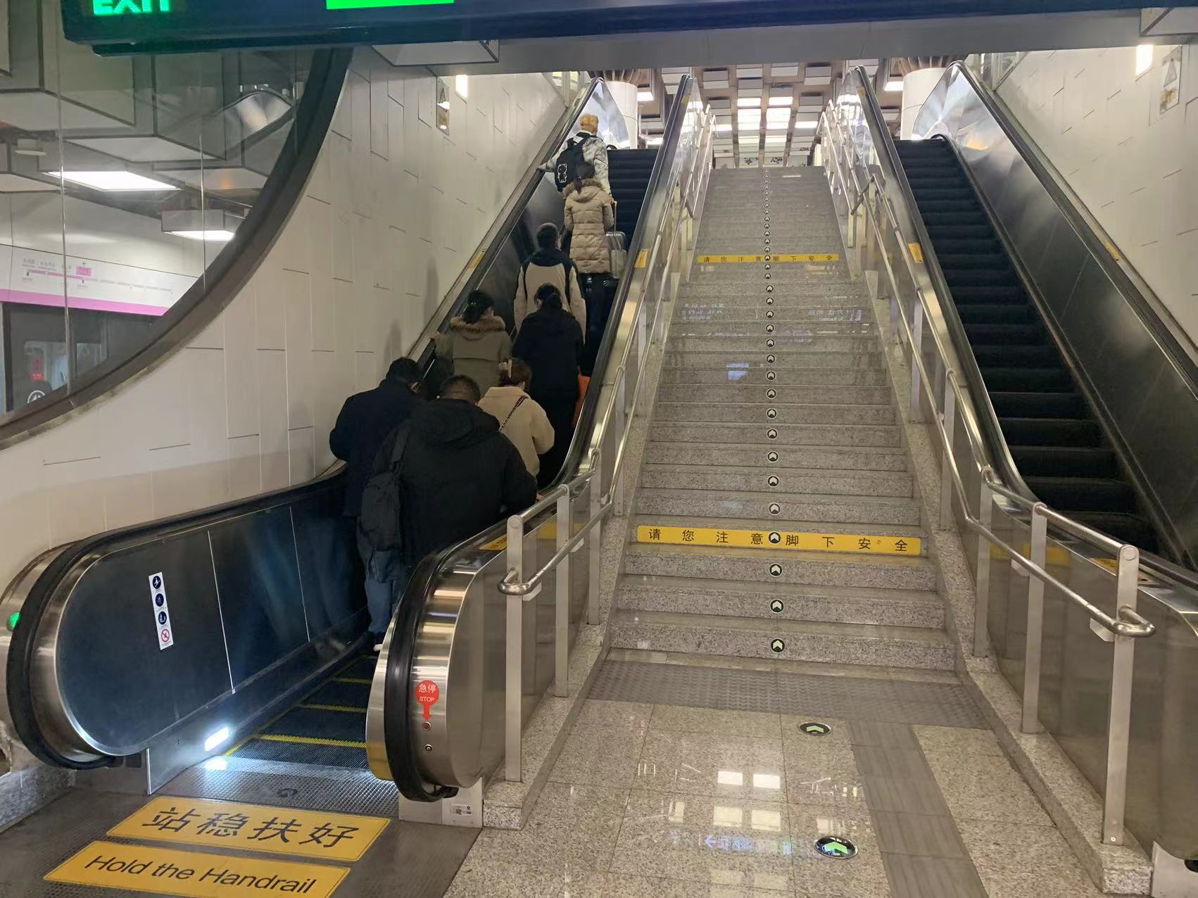 “乘坐扶梯时,请握好扶手站稳,注意脚下安全……”下午3点多,来到地铁5号线东四站换乘地铁六号线的上行自动扶梯旁,安全提示的广播不停地循环播放着。一位位搭梯的乘客也有序地站稳。这时,一位行色匆匆的乘客刚踏上扶梯,就一路从左侧的空当中快步跑上去。见此,站在扶梯上的人连忙侧身让行,但还是有人险些被撞倒。