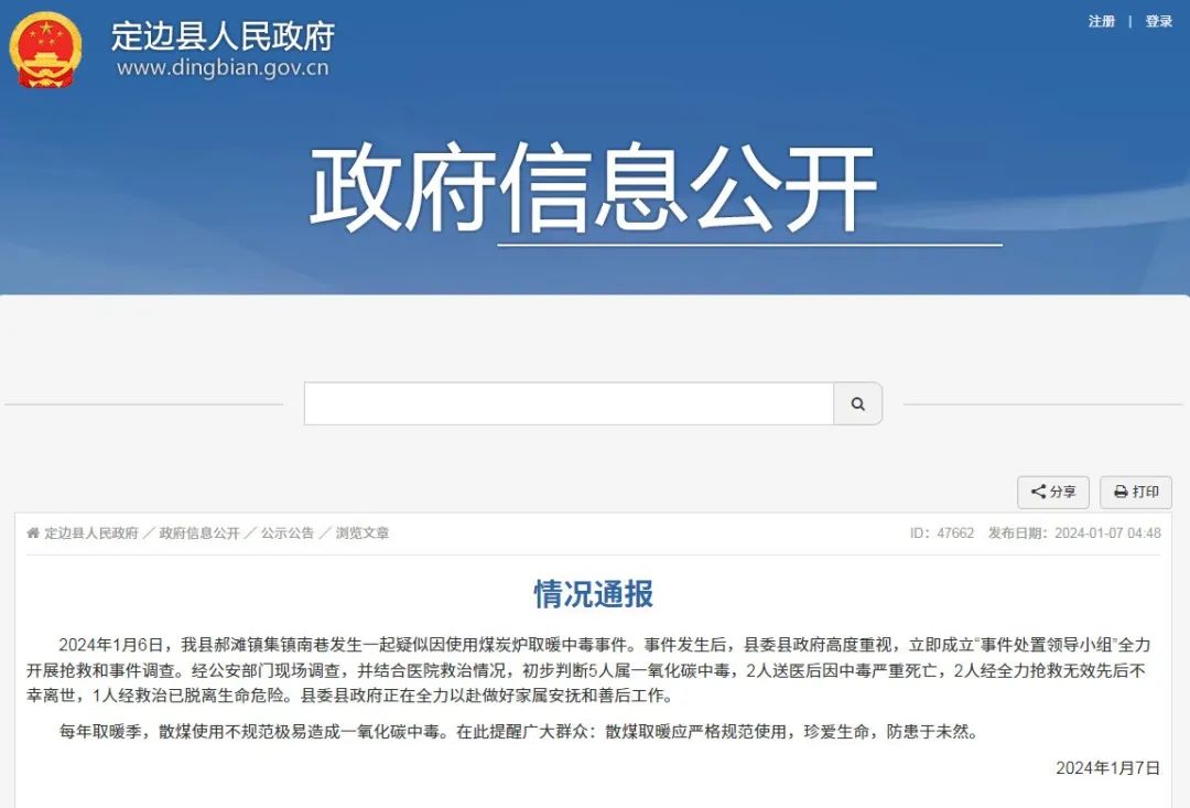 1月6日,陕西省榆林市定边县郝滩镇集镇南巷发生一起疑似因使用煤炭炉取暖中毒事件,7日凌晨,定边县发布情况通报。