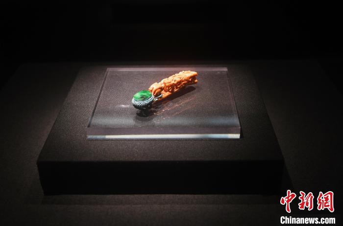 1月8日,清代翡翠珊瑚苍龙教子纹带钩在重庆中国三峡博物馆展出。中新社记者 周毅 摄