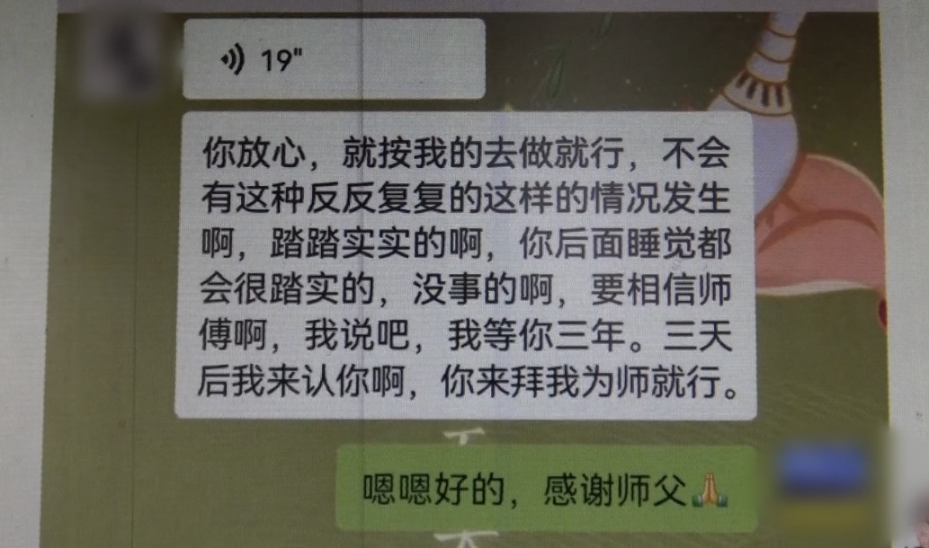 王女士回到家中后,“法师”一直与其保持微信联系,并再次指点迷津,说王女士需要办一场盛大的法事来消除命里不好的因素。“他说大型法会需要60多位僧侣,还需要各地的主持参加,相应的费用比较高 ,主持和这些师傅是分等级的,每个等级需要的出场费不一样 ,师傅们因为远道而来,需要一定的餐食费用,也需要寺庙一些修缮费用 。”王女士回忆道。