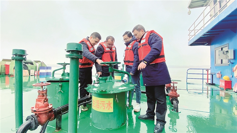 近日,湖北省公安县纪委监委紧盯长江干线船舶和港口污染防治、非法码头整治等“长江大保护”重点监督内容,联合生态环境、海事部门实地检查船舶生活污水、含油污水收集转运等情况,守护“一江清水”。李熙睿 摄