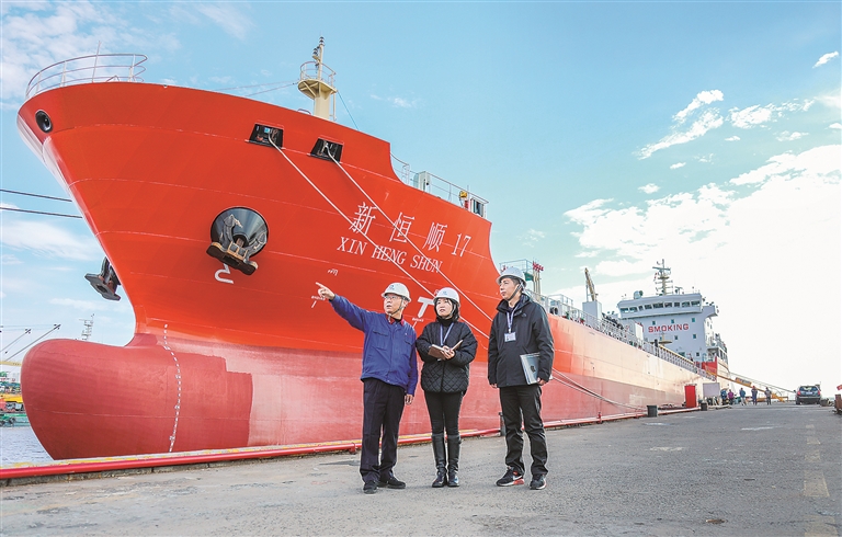 浙江省岱山县纪委监委聚焦营商环境优化提升,紧盯当地重点产业、重点项目开展调研监督,保障各项惠企政策措施落地。图为该县纪检监察干部走访船舶修造企业。王榕 摄