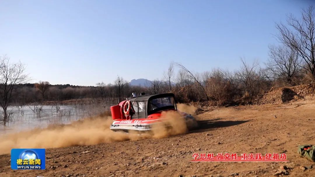 1月8日上午,在密云水库空域,首次无人机实装飞行训练正在进行,调试、起飞、到达指定位置、抓拍、画面回传,整个流程精准有序。库区水面上,橘红色的气垫船动力强劲,实现自由穿越陆地和水面。