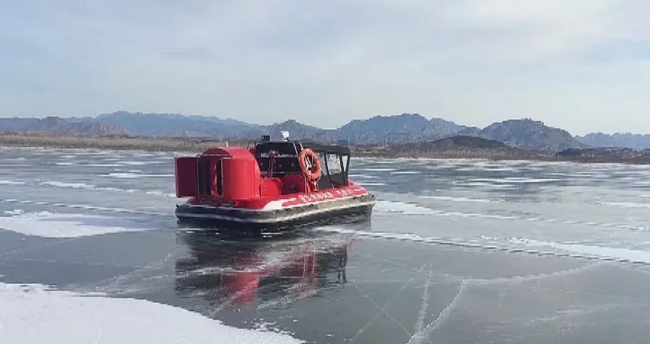密云水库综合执法大队执法人员王鹏告诉记者:“气垫船的优点是水陆两栖,它既可以在冰面上行驶,也可以在水面上行驶,尤其是在冬季执法的时候,有冰水相接的地方,它可以保护好我们执法人员的人身安全,而且它的速度非常快,可以提高我们的工作效率。”