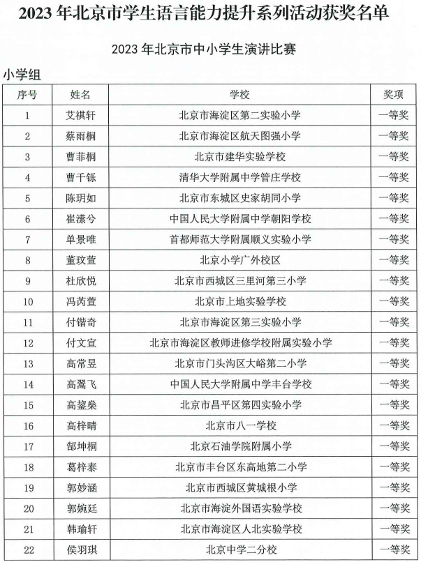 据北京市教育委员会网站消息,北京市教育委员会 北京市语言文字工作委员会近日发布了关于公布2023年北京市学生语言能力提升系列活动获奖名单的通知。获奖名单中有没有你的同学呢?跟着小编一起来看吧!