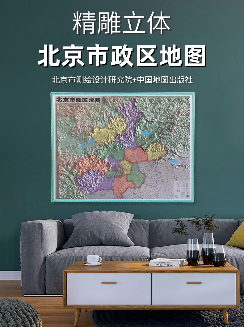 本地图长约1.2米,宽约0.9米,基于高精度地理信息数据,采用数控机床精细雕模,由高级PVC材质立体吸塑而成。制图区域东起唐山市玉田县,西到张家口市宣化区,南至廊坊市固安县,北到张家口市崇礼区。地图采取主区分区设色,结合邻区淡化晕渲的设计方案,让读者可以清晰、直观地了解北京市和区级政区范围、政府驻地、地形起伏、山脉走向,以及水系、交通、旅游等信息。