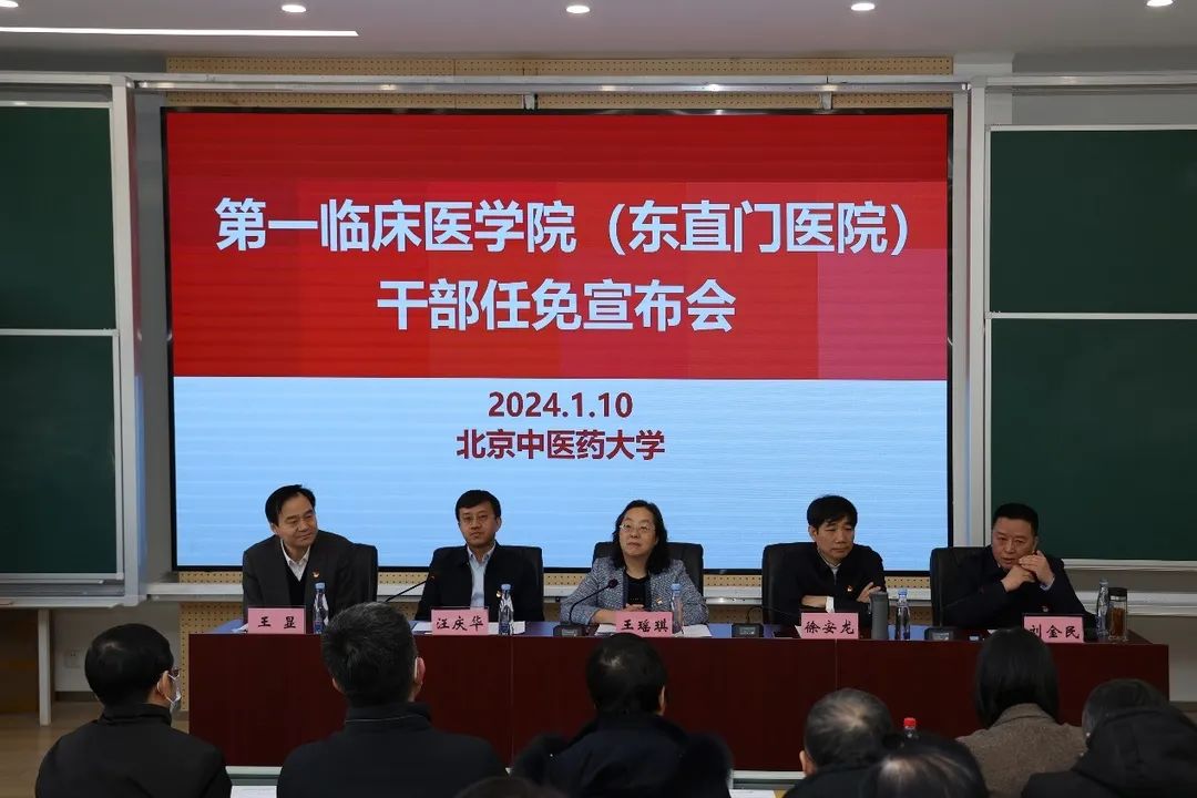 2024年1月10日,北京中医药大学第一临床医学院(东直门医院)召开干部任免宣布会。北京中医药大学党委书记王瑶琪,党委副书记、校长徐安龙,党委副书记汪庆华,党委组织部常务副部长李彧到会。医院领导班子成员、副科级以上中层干部、科主任、护士长及职工支部书记等参加会议。会议由北京中医药大学党委副书记汪庆华主持。