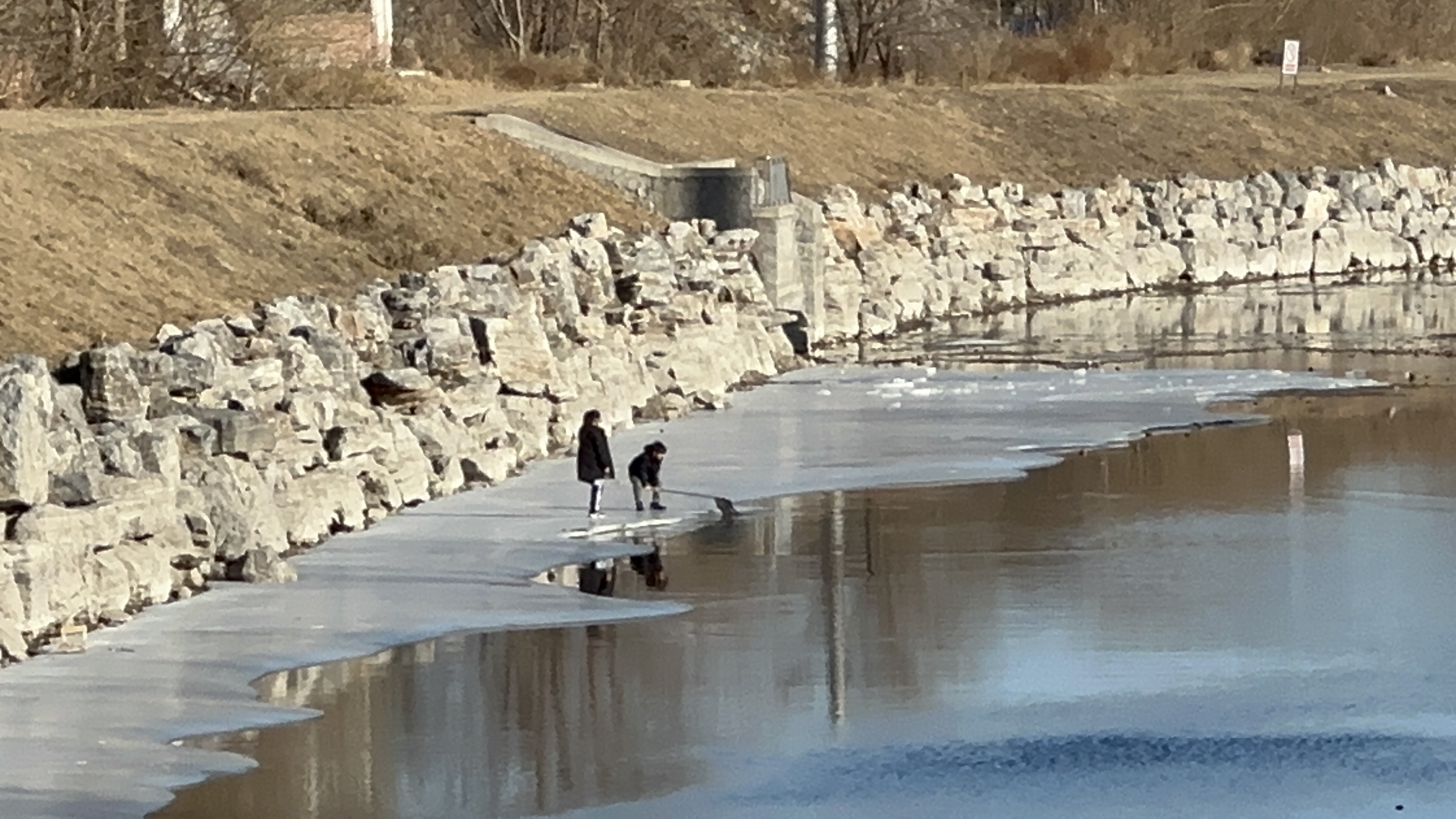 站在金中都南路辅路南侧的桥上向下看,丰草河的河面上已有大面积的融化水域,仅剩靠近北岸边三分之一的水面上还结着一层薄冰。不远处,约100米长的冰面上,传来孩子的嬉闹声。只见两个小孩站在冰面的边缘处,正拿着渔网在水中捞来捞去,不时还做出蹦跳等动作。