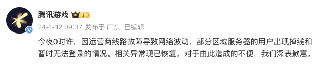1月12日上午,腾讯游戏官博发文致歉称,今夜0时许,因运营商线路故障导致网络波动,部分区域服务器的用户出现掉线和暂时无法登录的情况,相关异常现已恢复。