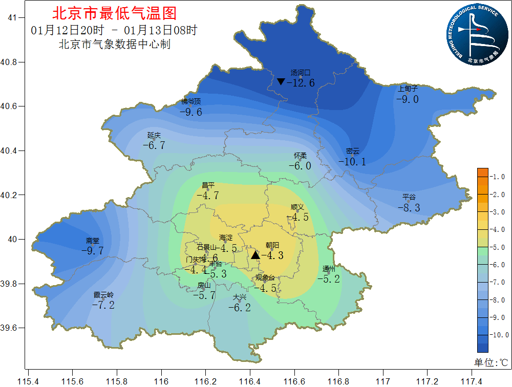 12日20时到13日08时,南郊观象台最低气温-4.5℃(13日02:56)